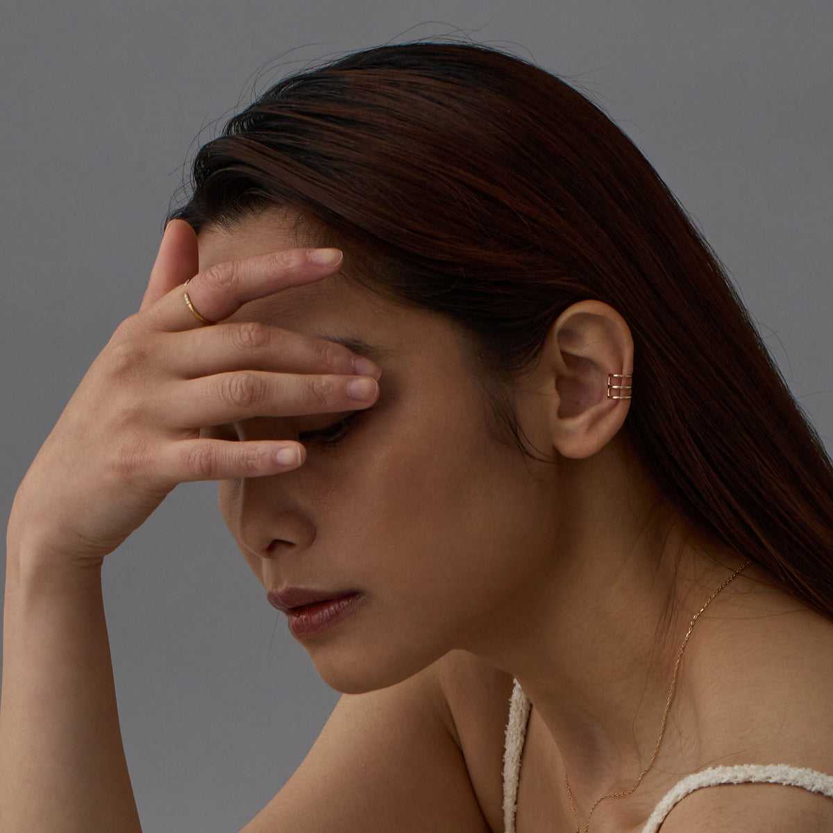 滑らかなゴールドラインが重なり合う、上品でモダンなレイヤードデザインのイヤーカフ。まるで複数のジュエリーを重ねづけしたような立体感が角度によって光を受けて繊細な陰影を生み出し、横顔を一段と美しく魅せてくれます。