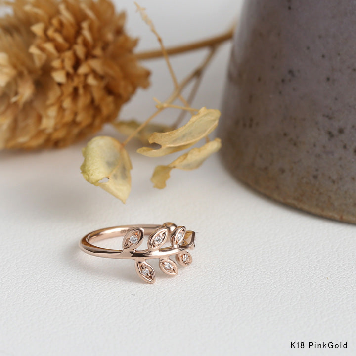 一枚一枚の葉には小粒ながら澄んだ輝きを放つメレダイヤモンドを丁寧にセッティング。熟練の職人が留めたダイヤモンドが凛としたスタイリッシュな表情を引き立て、ワンランク上の煌めきを演出します。