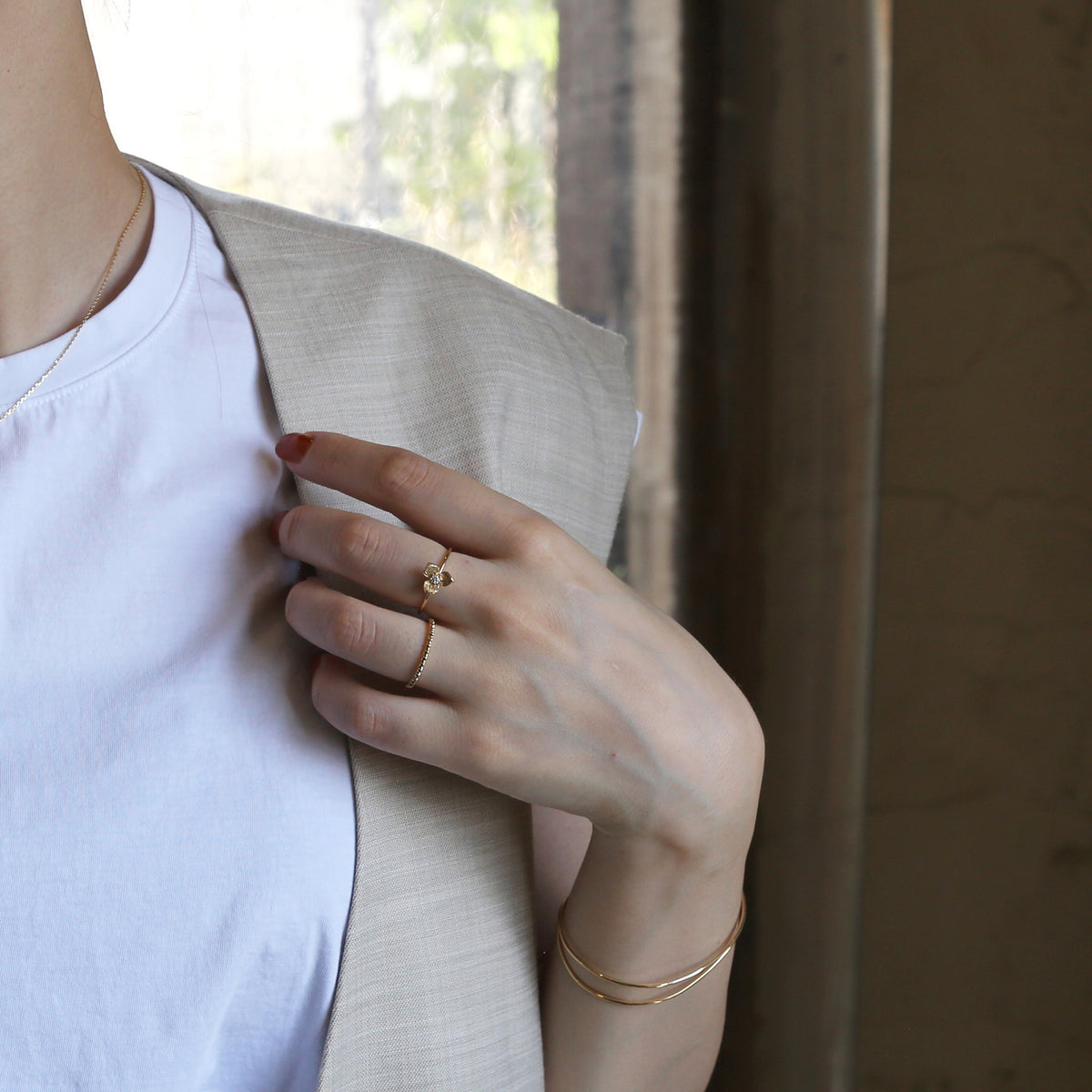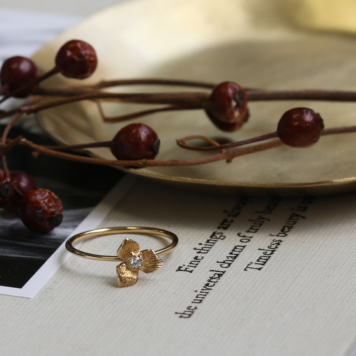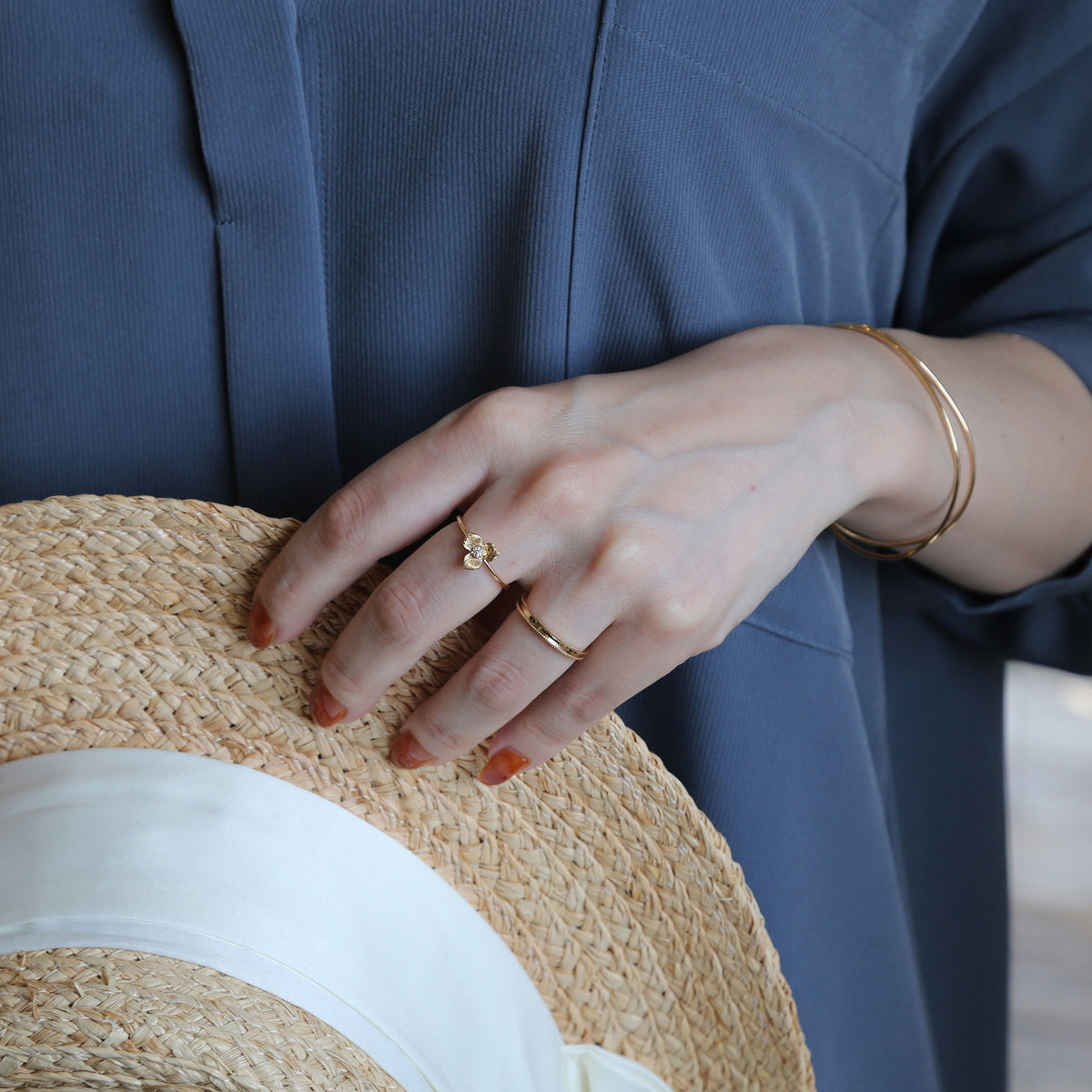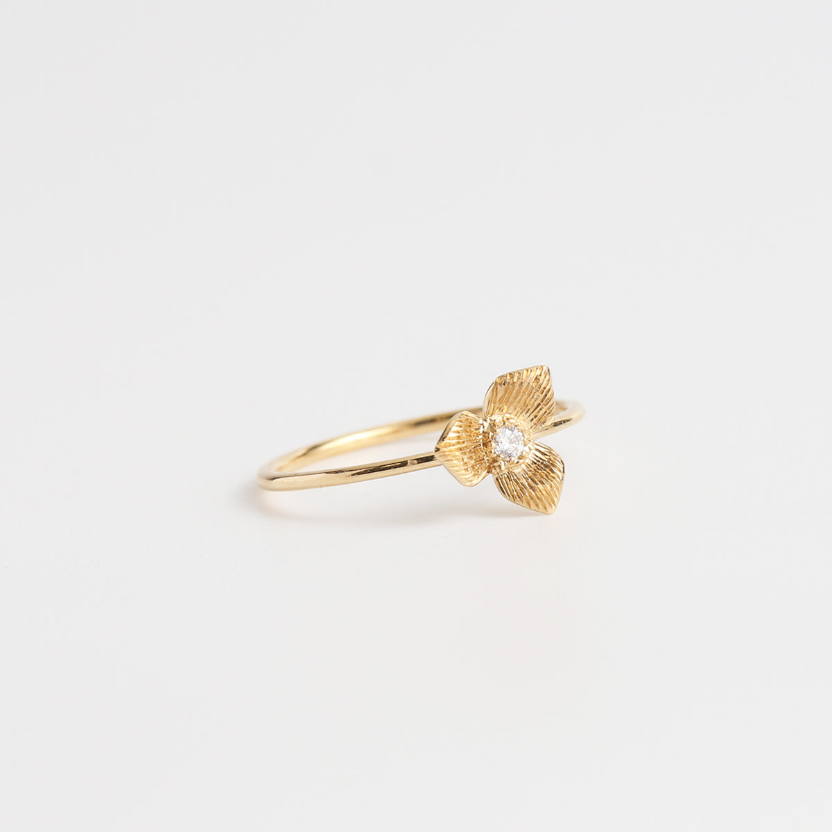 木陰に可憐な姿で咲き誇る”エンレイソウ”をモチーフにしたリング。大きな葉から小さな3枚の萼(がく)をつけ、一輪一輪、それぞれの茎に独立して咲くエンレイソウ。"奥ゆかしい美しさ"という花言葉を持ち控えめでありながら逞しく、凛とした女性像をエンレイソウに重ね合わせて表現しました。