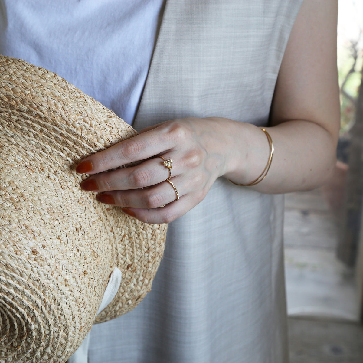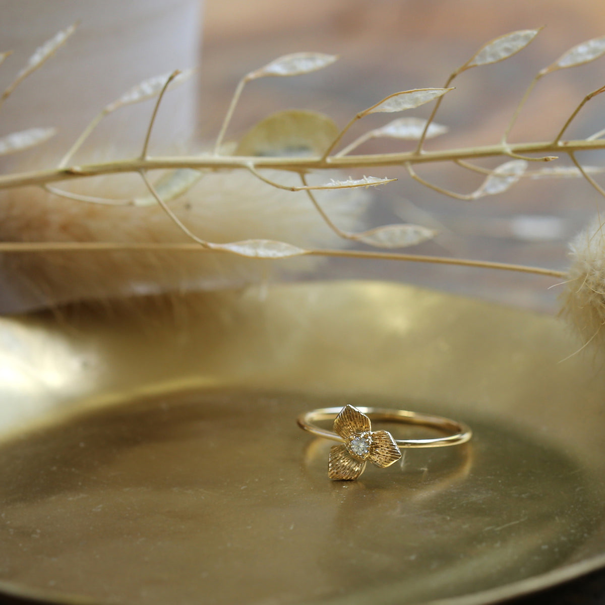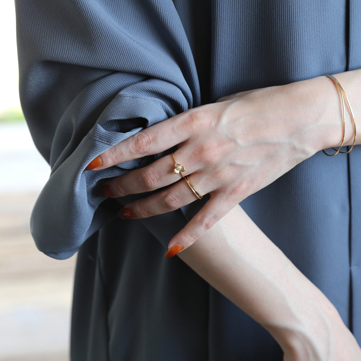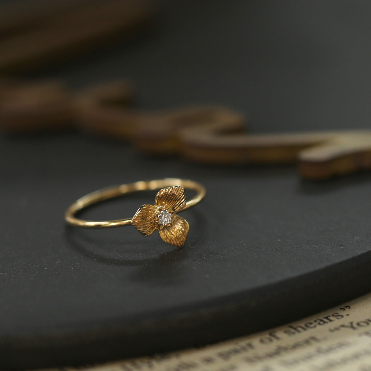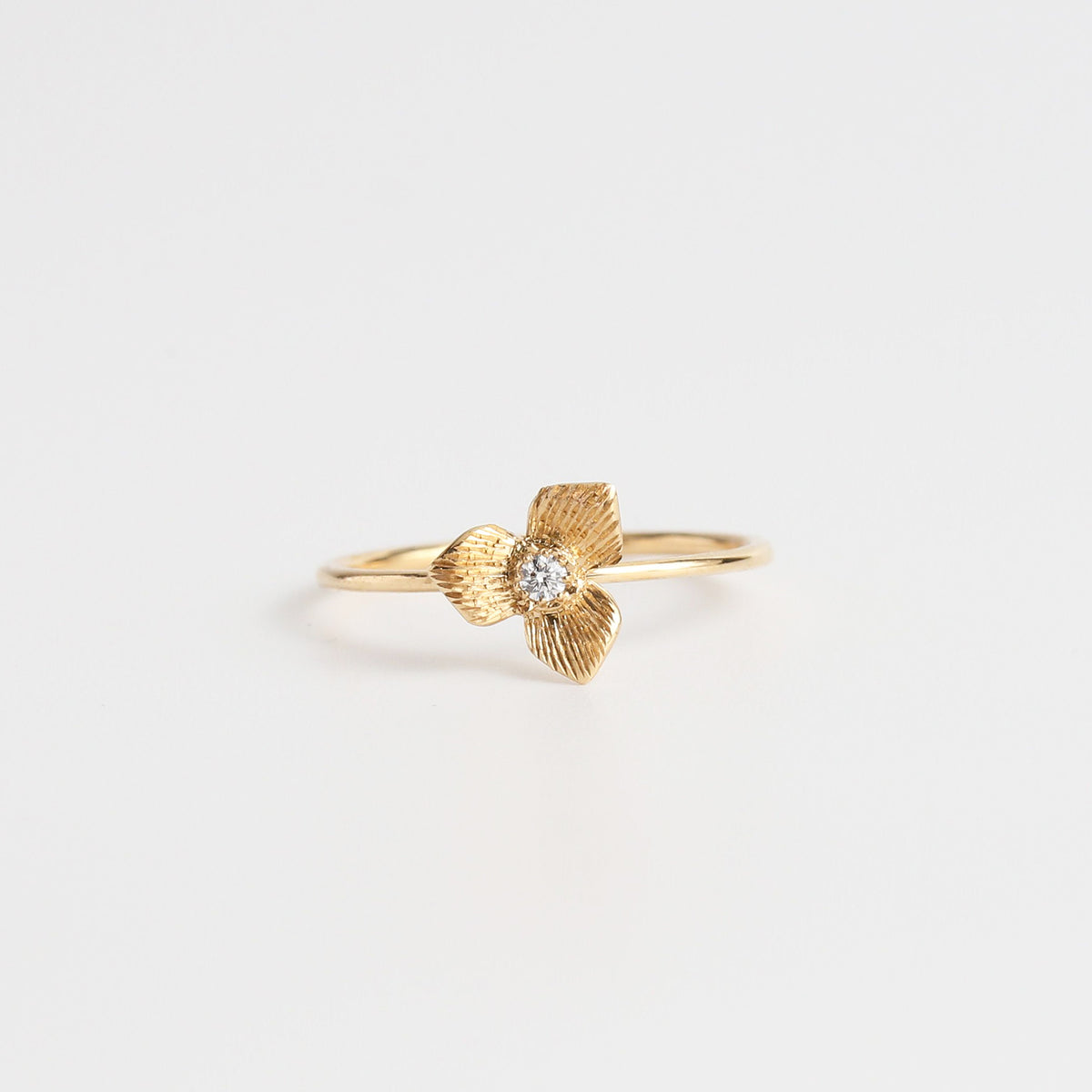 木陰に可憐な姿で咲き誇る”エンレイソウ”をモチーフにしたリング。大きな葉から小さな3枚の萼(がく)をつけ、一輪一輪、それぞれの茎に独立して咲くエンレイソウ。"奥ゆかしい美しさ"という花言葉を持ち控えめでありながら逞しく、凛とした女性像をエンレイソウに重ね合わせて表現しました。