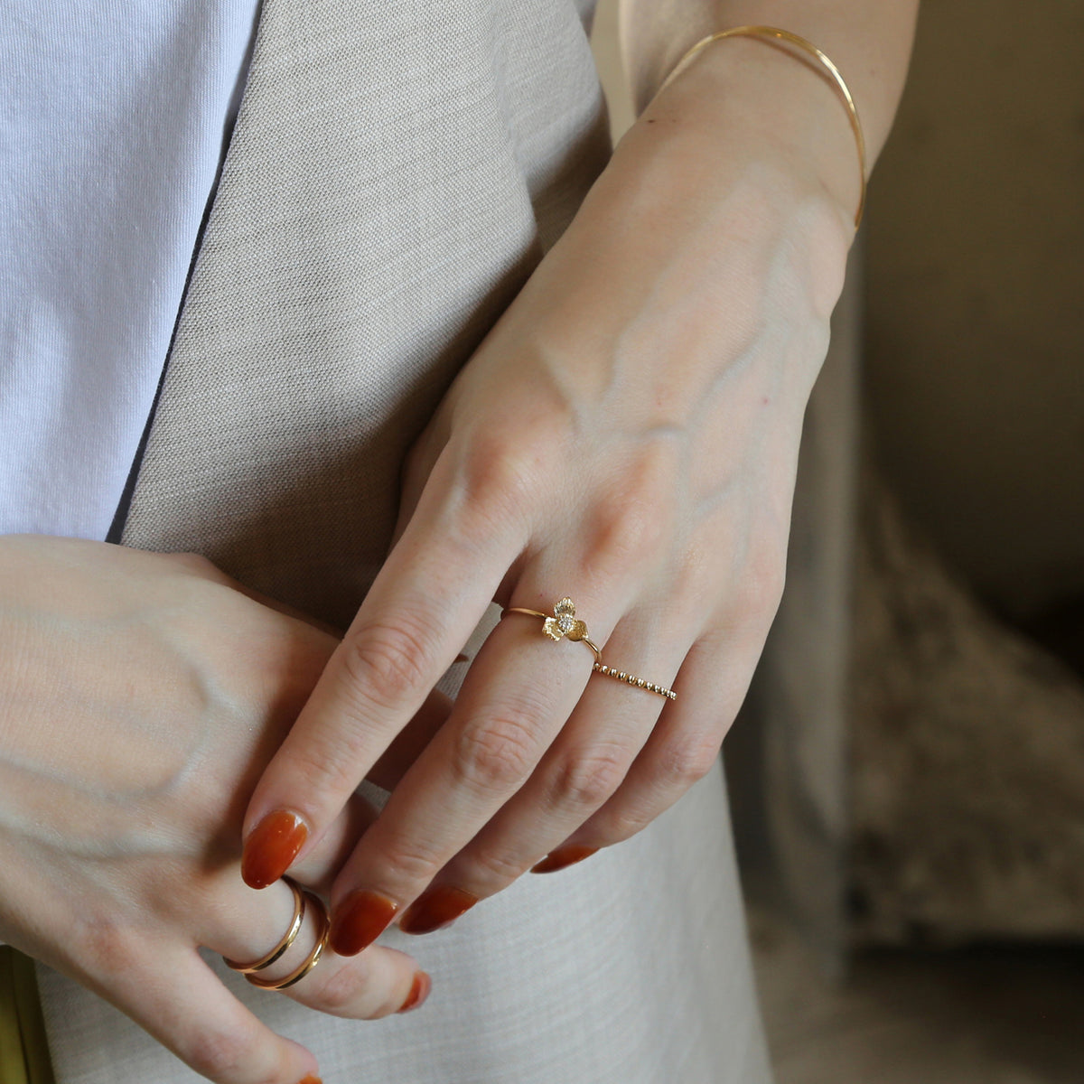 材質は上質なゴールドを用いて一枚一枚、異なる花びらの表情に拘り、花びらの表面には丁寧に繊細な彫金技術を施しました。機械ではなく職人の手仕事によって施された細工、無数の光のラインそれぞれが輝きを放ち、角度によって様々な表情を魅せてくれます。1つ1つ丁寧に細工される彫金は 全く同じモノを存在させず、まるで年代を経たアンティークジュエリーのような仕上がりに。