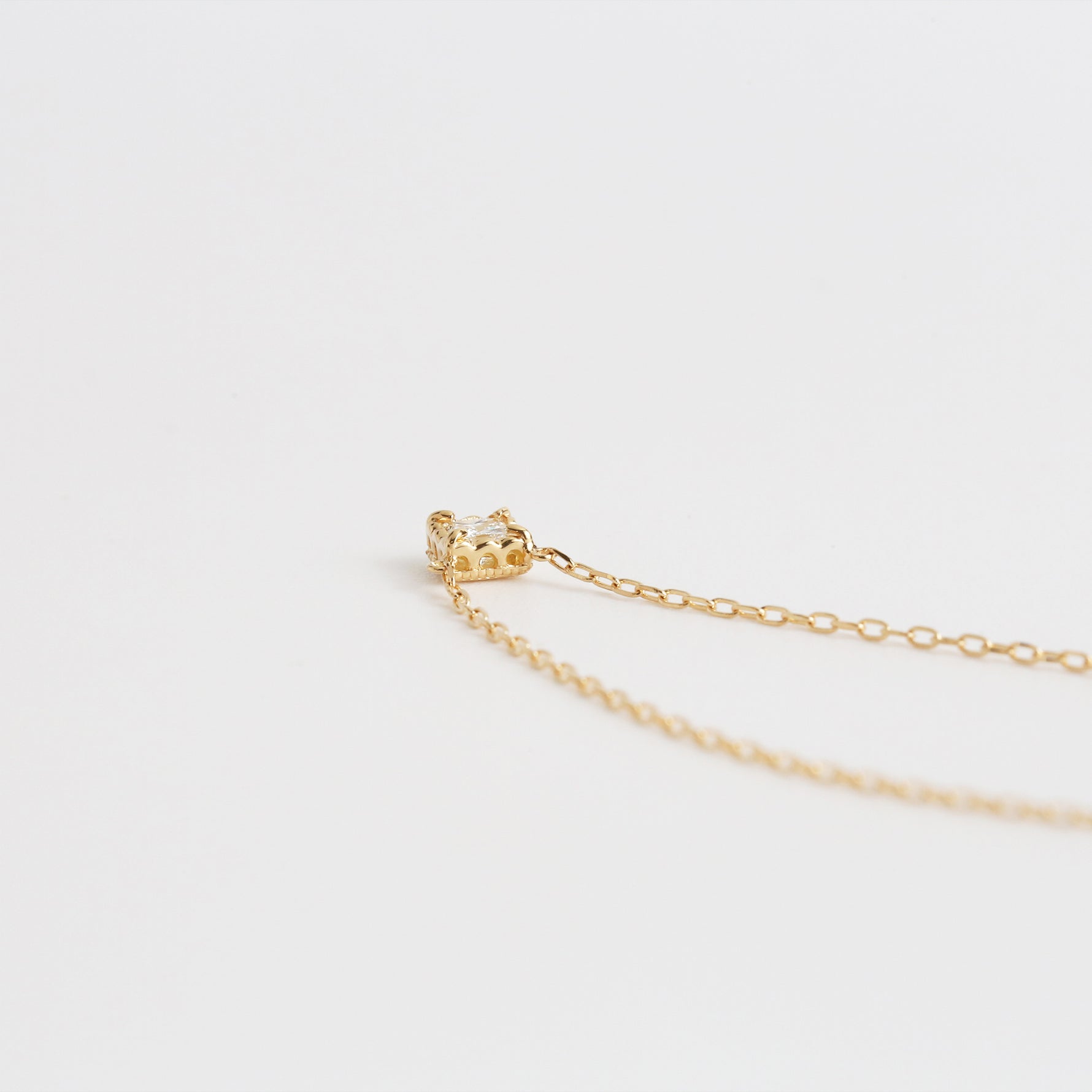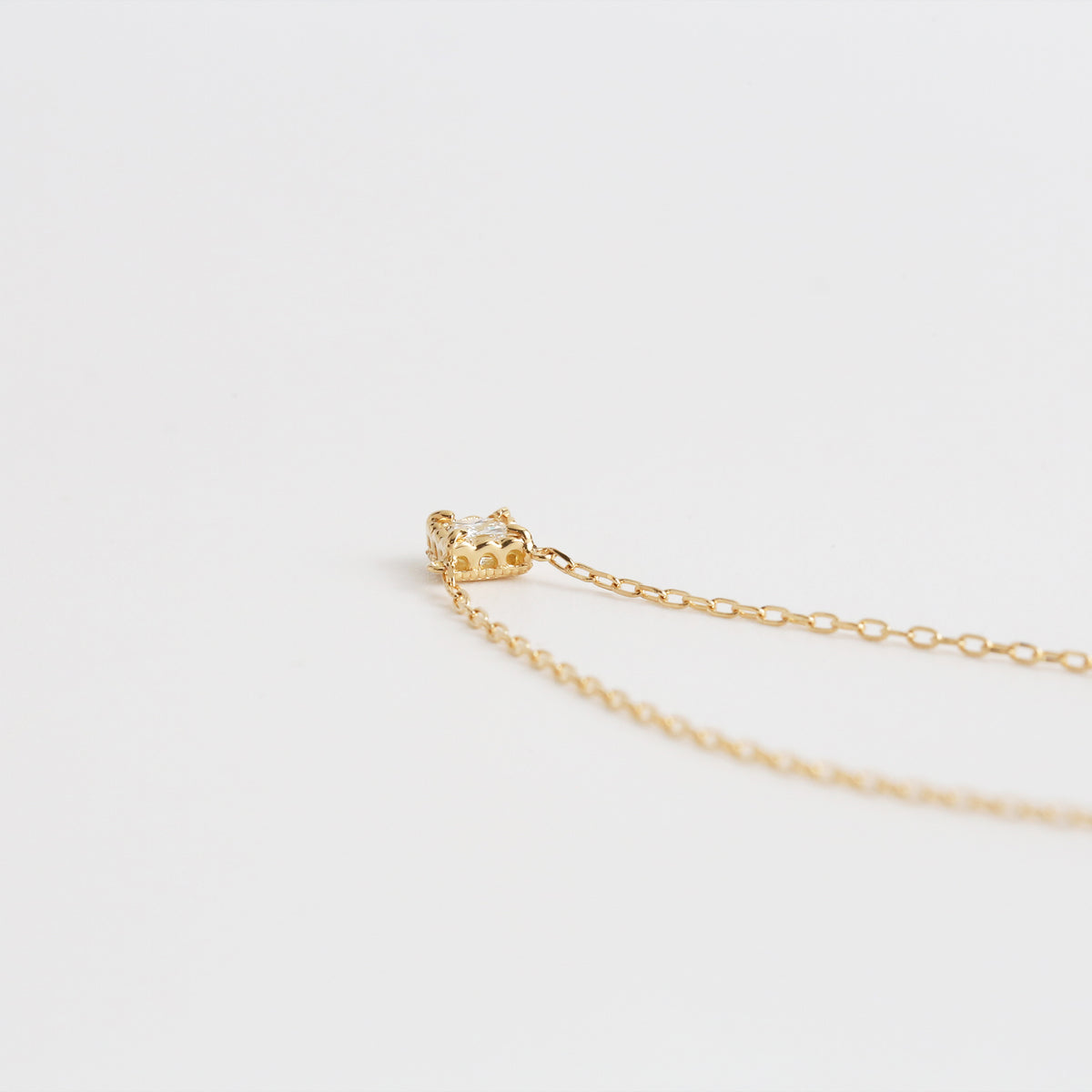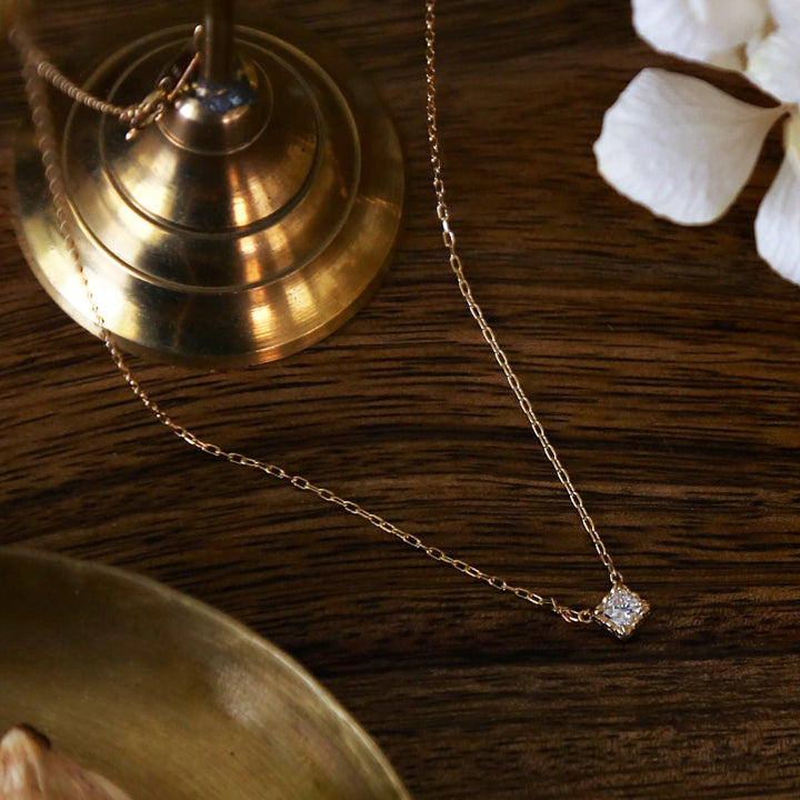 シャープな輝きが魅力のプリンセスカットダイヤモンドを繊細な装飾で包み込んだ一粒ネックレス。石枠にはアーチを描く透かし模様とミルグレインを施し、正面からだけでなくサイドから覗いても美しいクラシカルな佇まいを楽しめるシンプルながら特別感のあるデザインです。