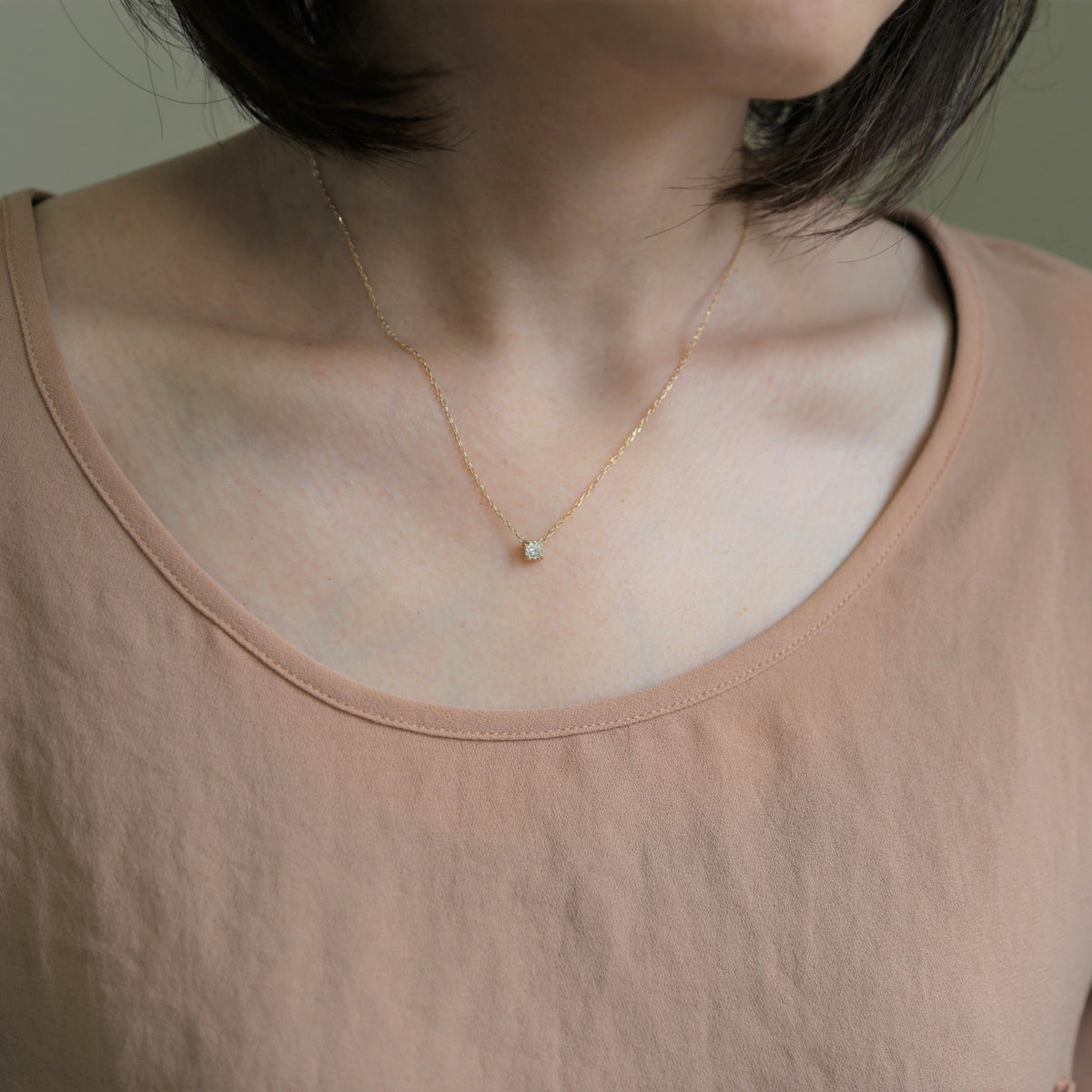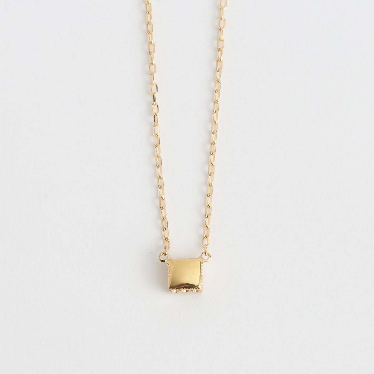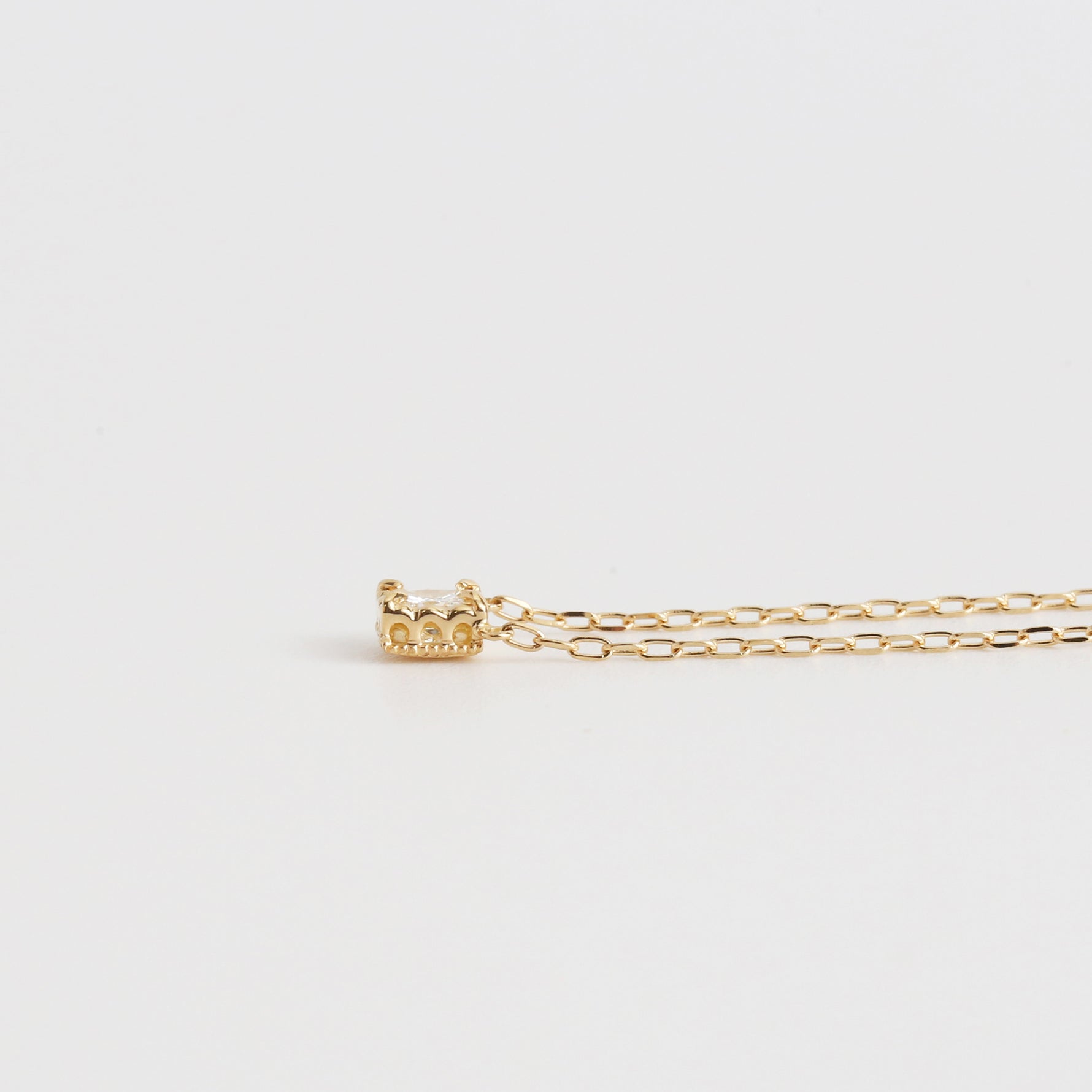 シャープな輝きが魅力のプリンセスカットダイヤモンドを繊細な装飾で包み込んだ一粒ネックレス。石枠にはアーチを描く透かし模様とミルグレインを施し、正面からだけでなくサイドから覗いても美しいクラシカルな佇まいを楽しめるシンプルながら特別感のあるデザインです。