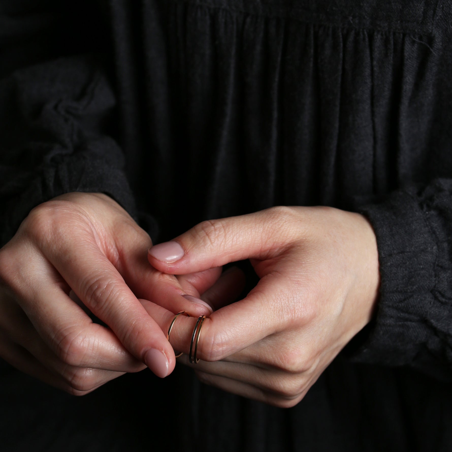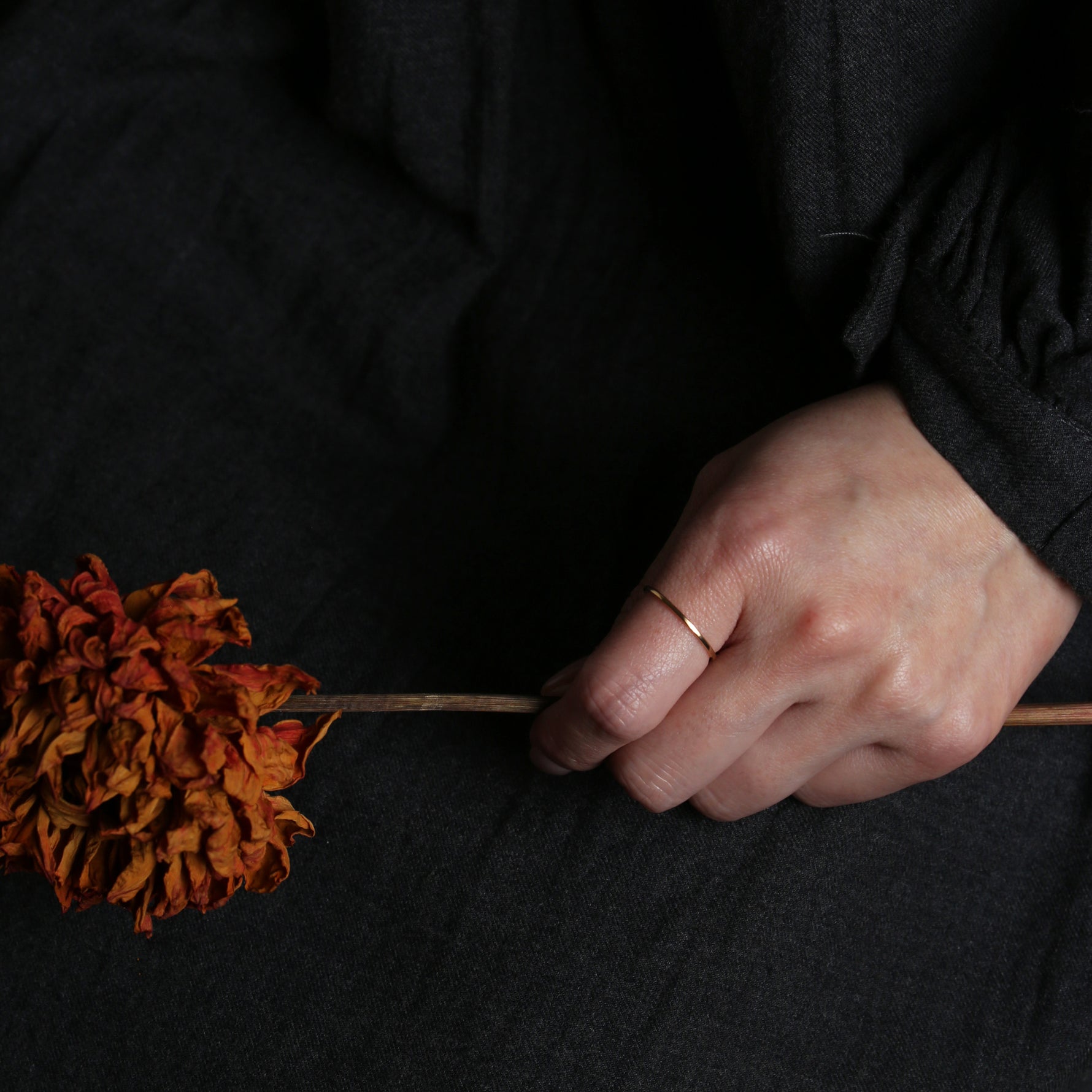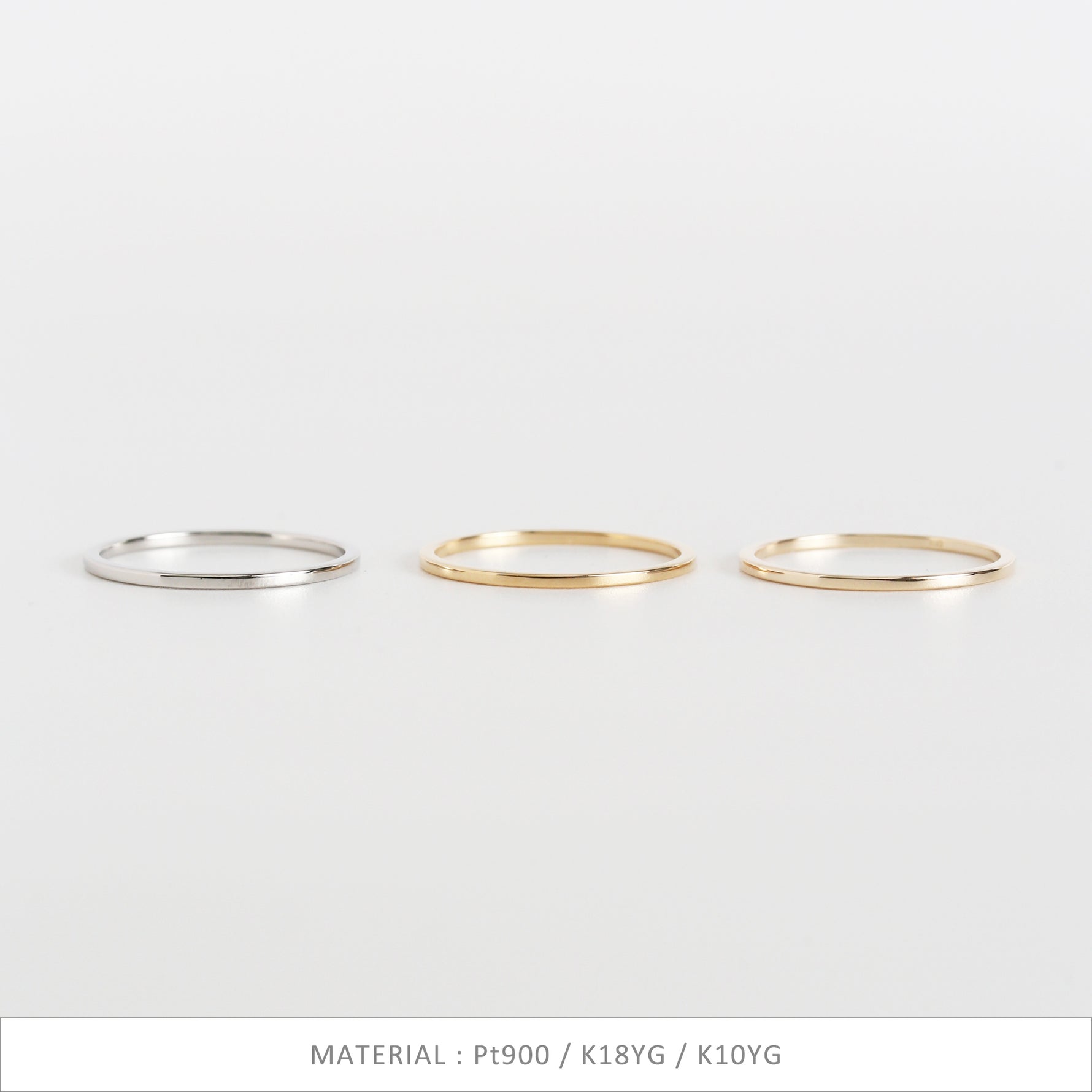 無駄を削ぎ落としたフラットなフォルムが、指先にそっと寄り添うように輝く極細リング。甲丸とはまた違う、凛としたミニマルさが魅力。細くても存在感があり、手元のラインをすっきりと整えてくれます。