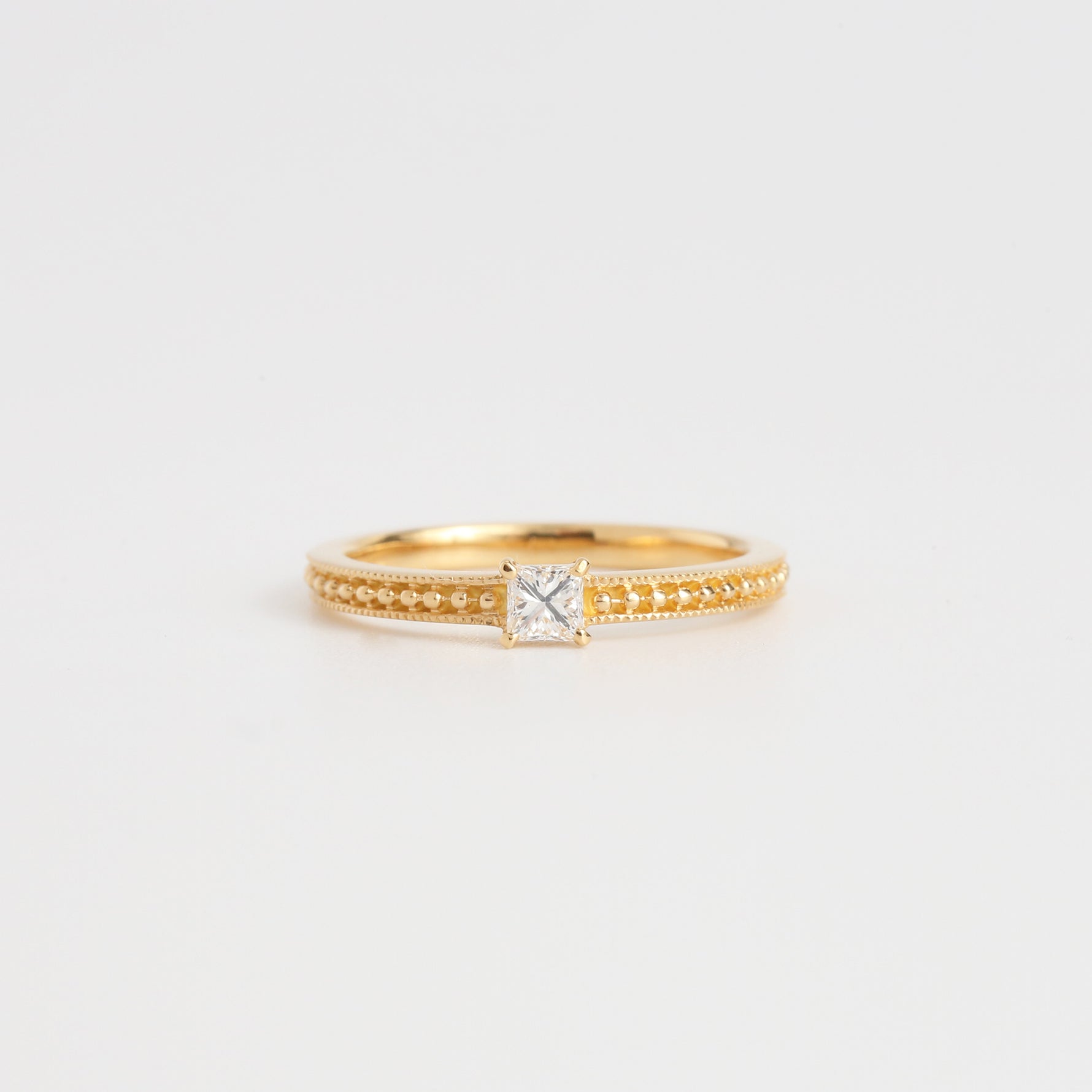 プリンセスカットダイヤモンドがひときわ輝く、一粒ダイヤモンドリング。シンプルな王道スタイルに、クラシカルなディテールを贅沢にあしらった大人のための上質なジュエリーです。