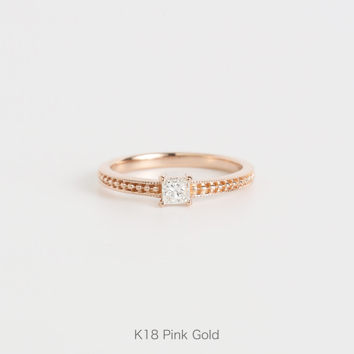 アームの両サイドには熟練の技で施された繊細なミルグレイン加工。その間に連なる小さな飾り玉がアンティーク調の趣を添え、気品あふれるプリンセスカットの輝きをより一層引き立てます。
