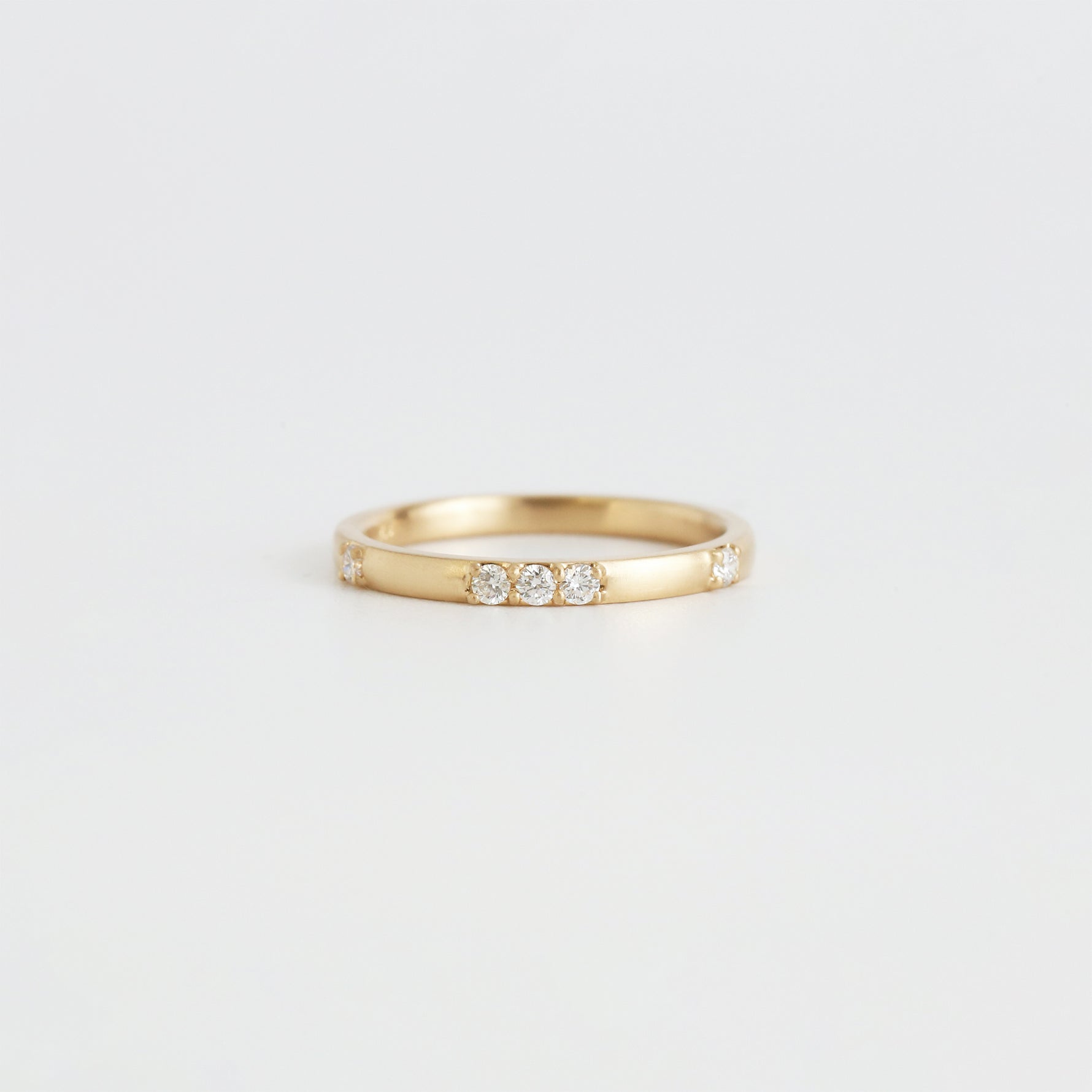繊細で華奢なリングに、サラッとしたシルクのような上質な艶消し加工を施しました。ゴールドを使用して、ベーシックを基調としたシンプルでモダンな日常使いに最適なダイヤモンドリングです。程よいボリューム感のあるディテールは普段使いアイテムとしてはもちろん、マリッジリングとして愛用することもできます。