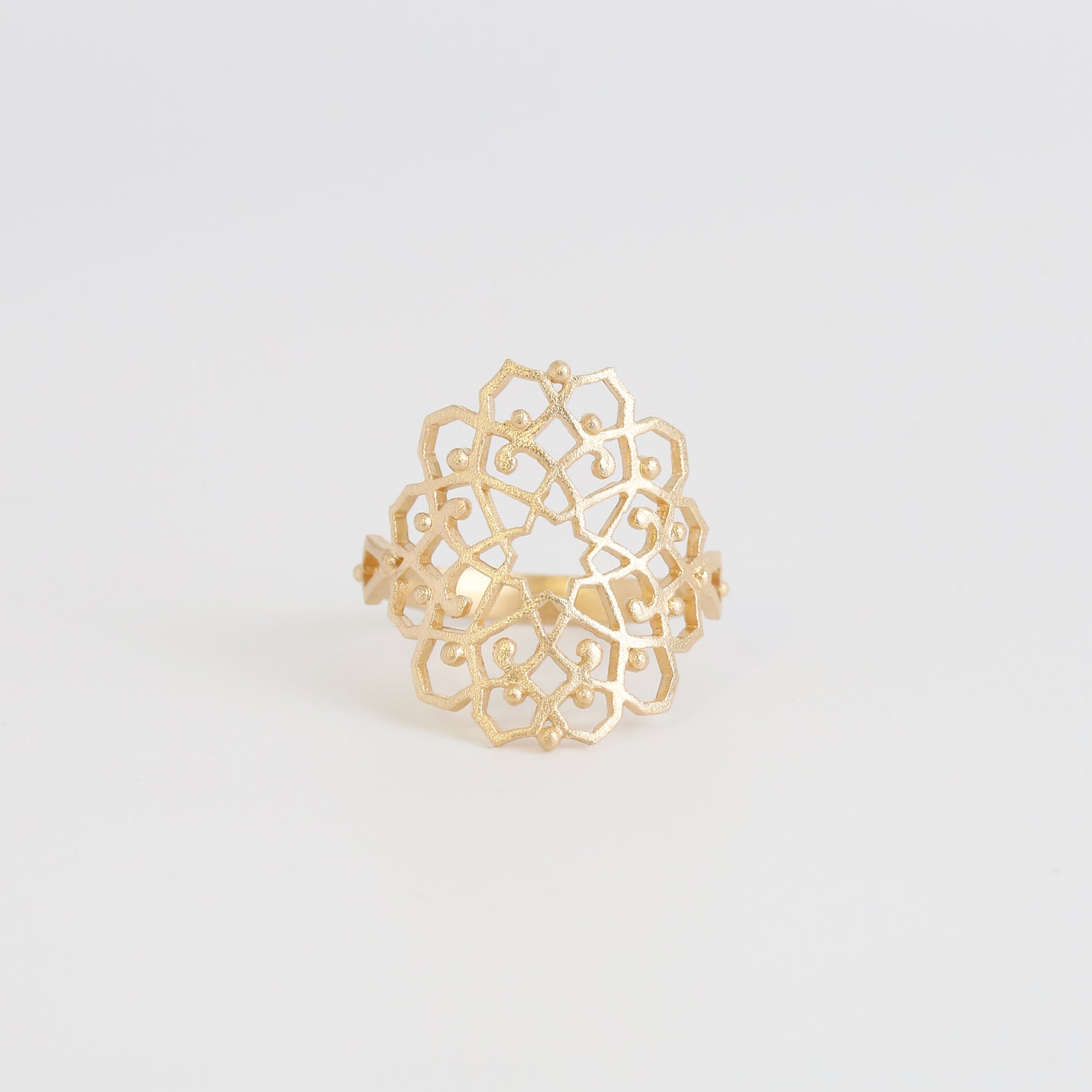 透かし柄モチーフの中でも人気のネックレスをベースに作り上げたK18ゴールドリング。ハンドクラフトで丁寧に作り上げたクチュール感のある華やかな表情。エレガントな光沢感を与える艶消し(ホーニング)加工に、ノスタルジックに咲き誇る透かしの花、肌馴染みが良く上品で存在感のある大人の手元を作り出してくれます。