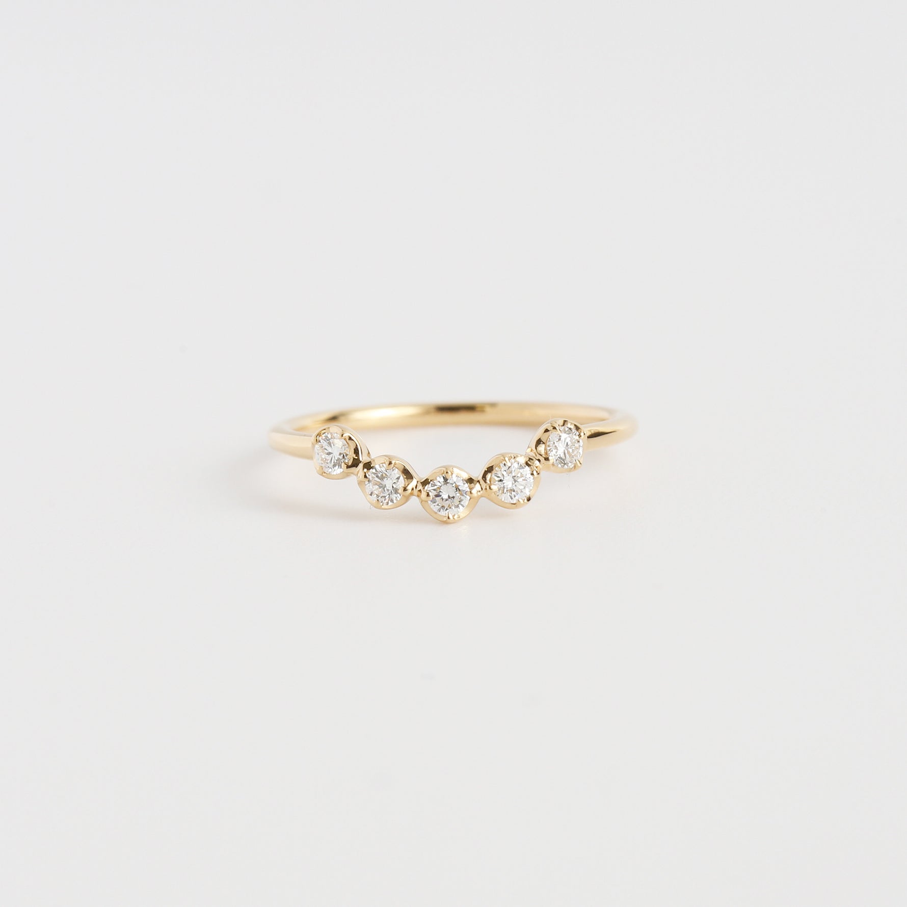 ほんのりと女性らしい色香を漂わせる、柔らかなUラインのダイヤモンドリング。選び抜かれた5石の上質なダイヤモンドがスレンダーなアームの上で端正に輝き、程よいボリューム感を生み出します。