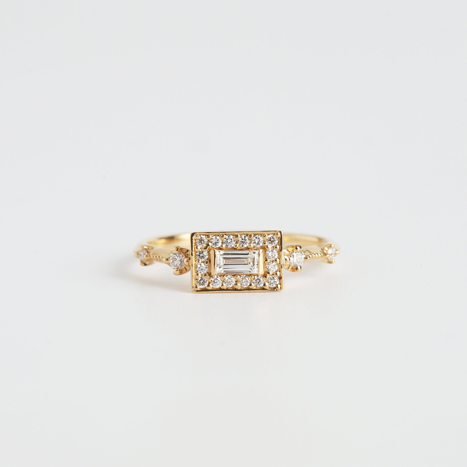 品格漂う落ち着きのある澄んだ輝きが魅力のバケットカットダイヤモンドをセレクトし、メレダイヤモンドの煌めきで包み込んでクラシカルな印象に仕上げたリング。それぞれ異なる輝きのカットを採用することで、より深みのある表情豊かな輝きを演出。