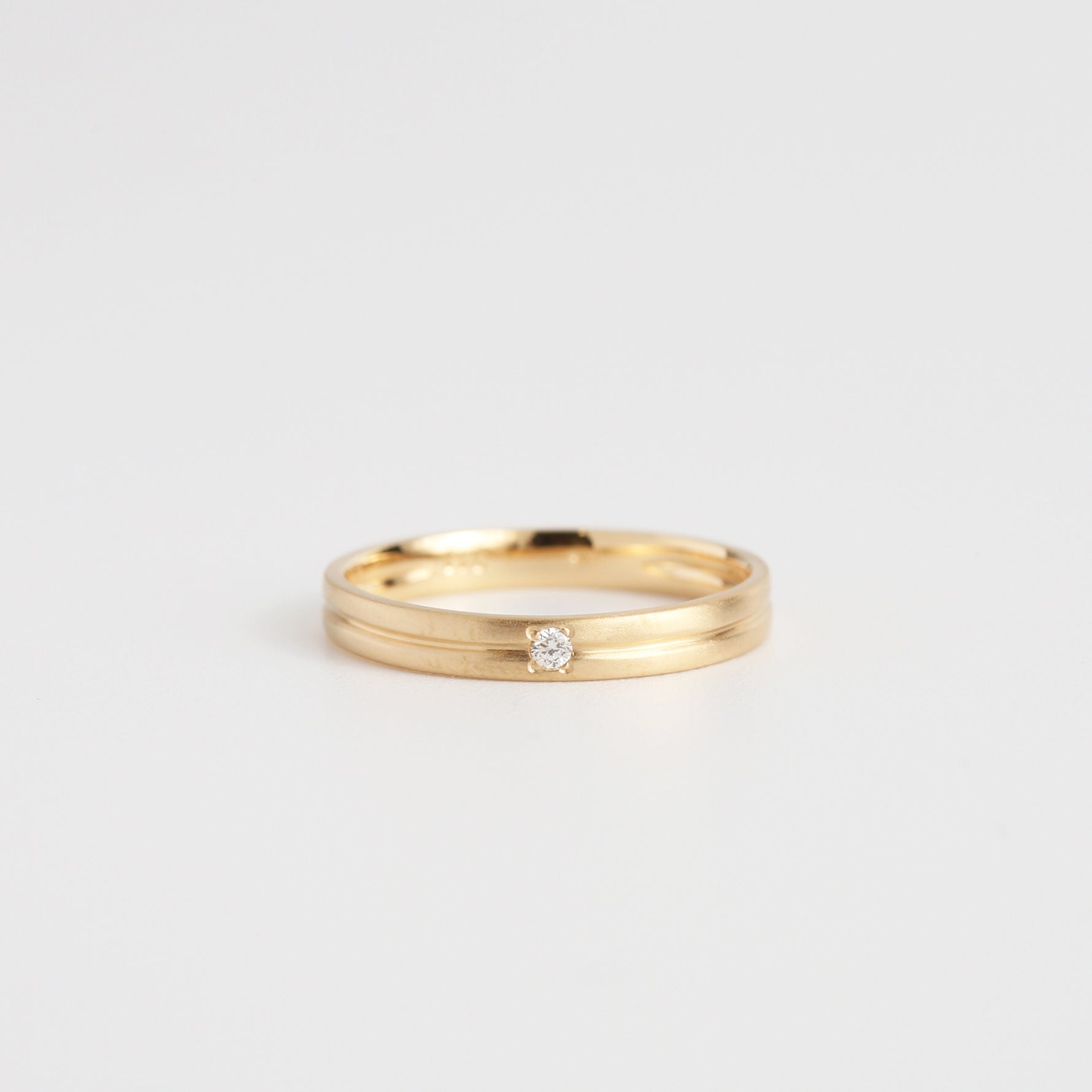 ダイヤモンドの眩い輝きと、使い込むほどに味わいを増す艶消しゴールド。その組み合わせがシンプルでありながらも愛着のわく表情豊かなリングを完成させました。デイリーに取り入れやすいデザインだからこそ、毎日の暮らしに寄り添いながら指先を彩ってくれます。