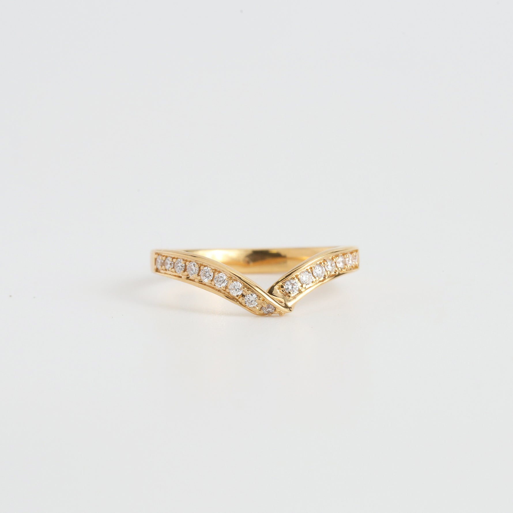 リボンを緩くひねったようなVラインが美しい、上品な佇まいのリング。艶やかなゴールドのアームに沿って、ダイヤモンドを小さな爪で丁寧にセッティングし、均整のとれた輝きのラインを描き出しています。Vラインのデザインは指をすっきりと長く見せてくれるのも嬉しいポイント。