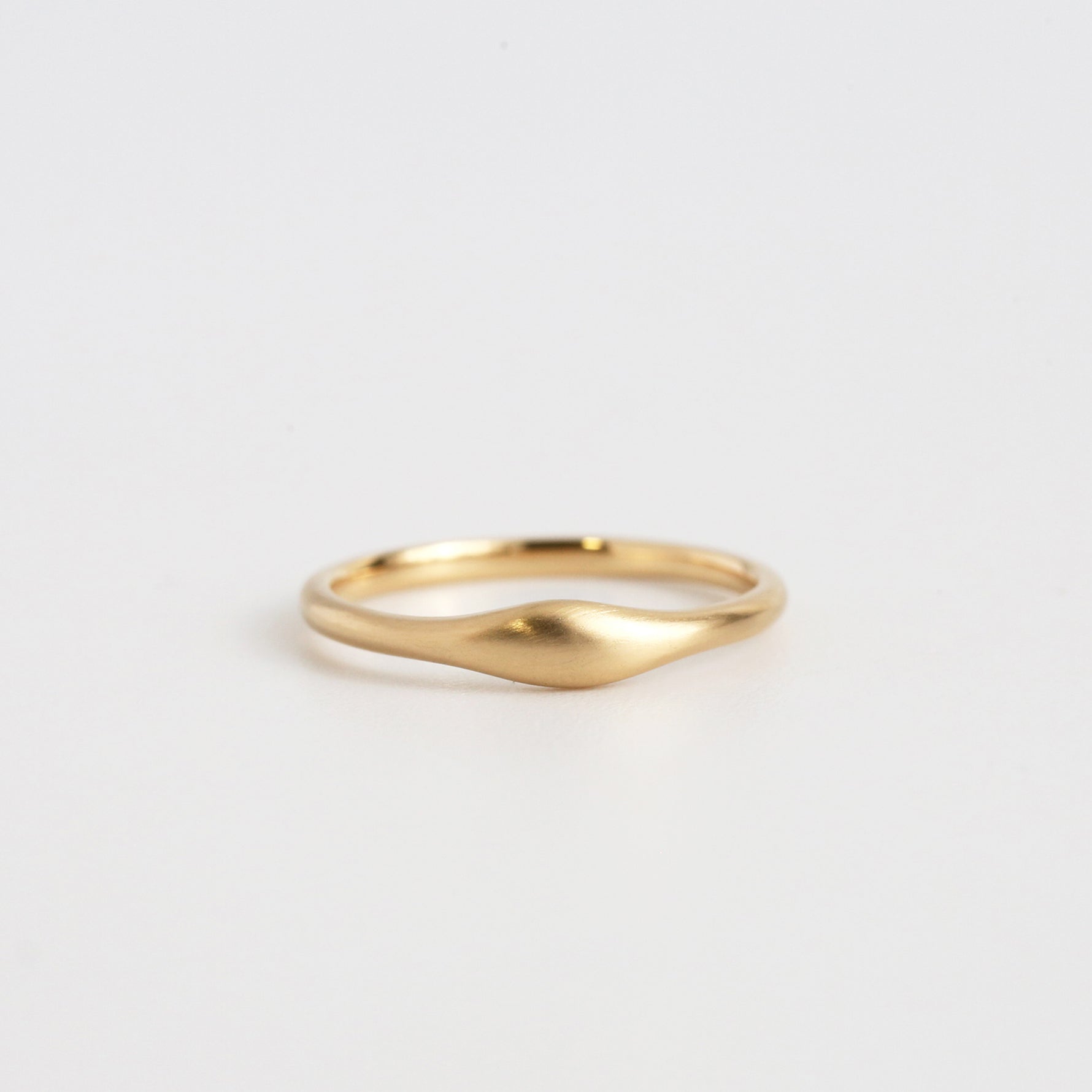 肌に溶け込むように滑らかな艶消し加工により、使い込むほどに独特な風合いが現れる艶消しゴールド。センター部分にボリュームを持たせ、抜け感のあるこなれた印象のワンポイントリングは、細身のリングやデザインリングとのレイヤードにもぴったりのアイテムです。