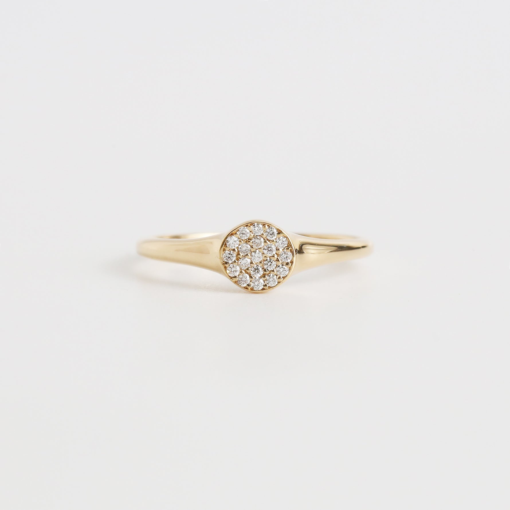 シグネットリングのようなシルエットに愛らしいサークルモチーフがモダンで洗練された印象。台座にひとつひとつ丁寧にダイヤモンドを敷き詰めて、小粒のダイヤモンドから放たれる細やかな光が集まることで抜群の存在感と優美な輝きを演出します。繊細で上品な輝きが永く愛され続ける「パヴェデザイン」は大人の凛とした華やかさを引き出す特別な輝き。装いに強く美しく輝く優美なダイヤモンドリングです。