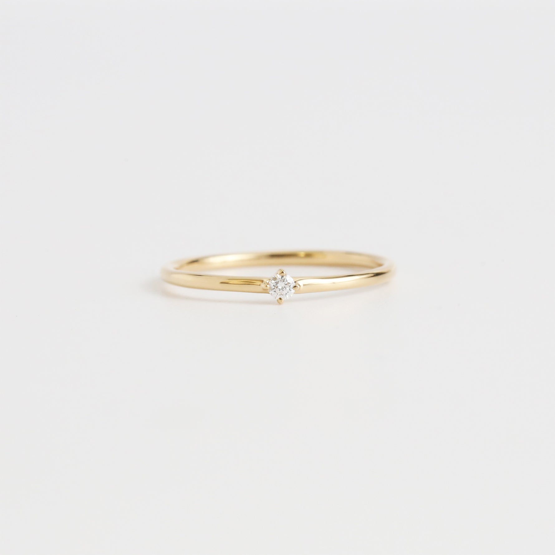 極細で華奢なアームが上品な煌めきを添える一粒ダイヤモンドリング。上質なダイヤモンドとK18ゴールドの素材感を最大限に生かす、シンプルで潔いデザイン。テリの良いダイヤモンドを感じていただけるよう、なるべく小さな爪で留めることで、アームの上にダイヤモンドだけがのっているかのようなヌーディーな輝きを纏います。 ダイヤモンドは小さくても眩い輝きを放ち、そして、小さいからこそデイリーに楽しみやすいモノであるということもまた魅力のひとつです。