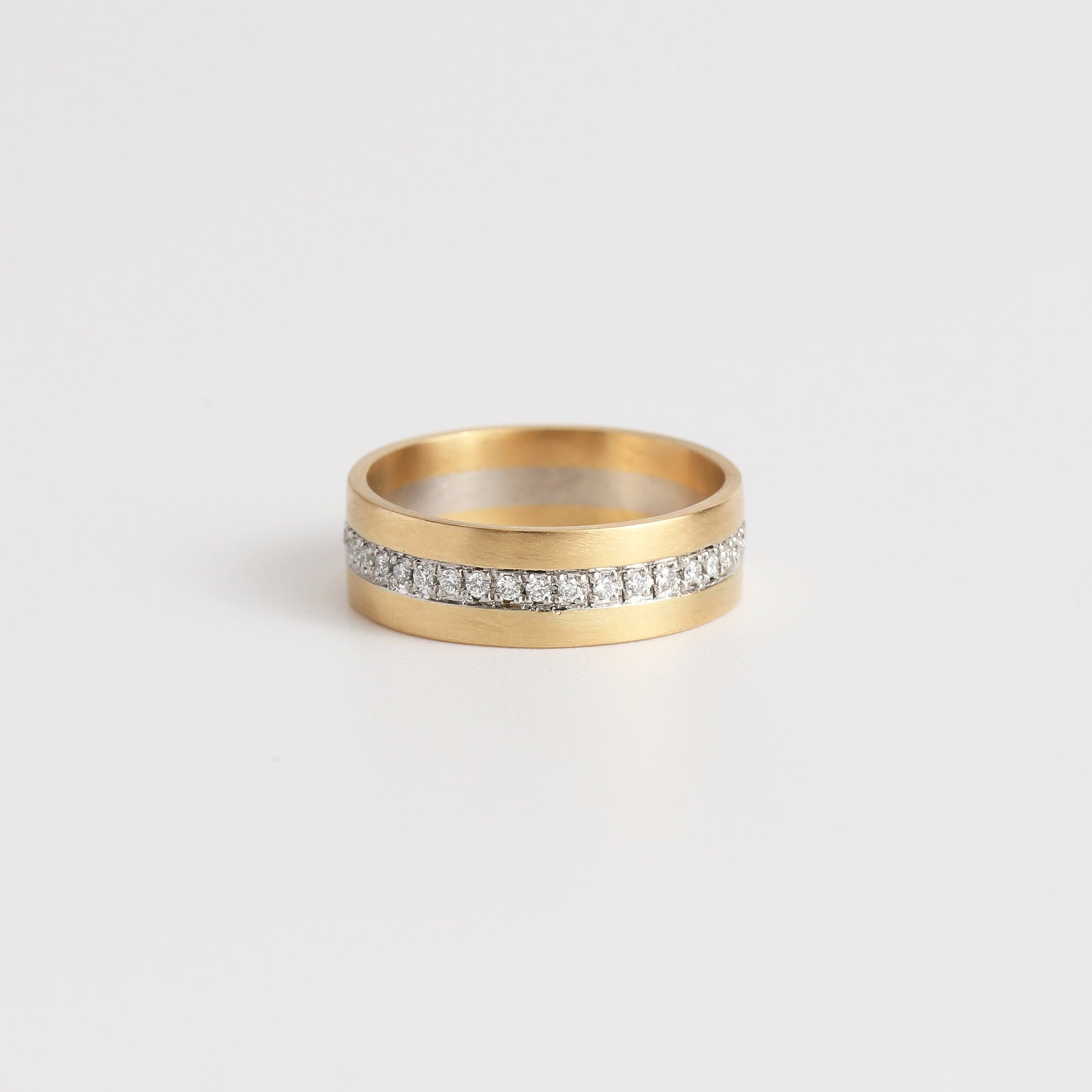 プラチナ部分に敷き詰められたダイヤモンドは「堀り留め」を採用しています。地金の表面に小さな爪を掘り起こして留めていくことで、端正で煌びやかな輝きをそのまま映し出すことができます。リングは幅違い、本数違いの3タイプをご用意しています。まるで重ね付けをしているような異素材のコントラスト、ダイヤモンドが贅沢に輝くエレガントなエタニティリング。