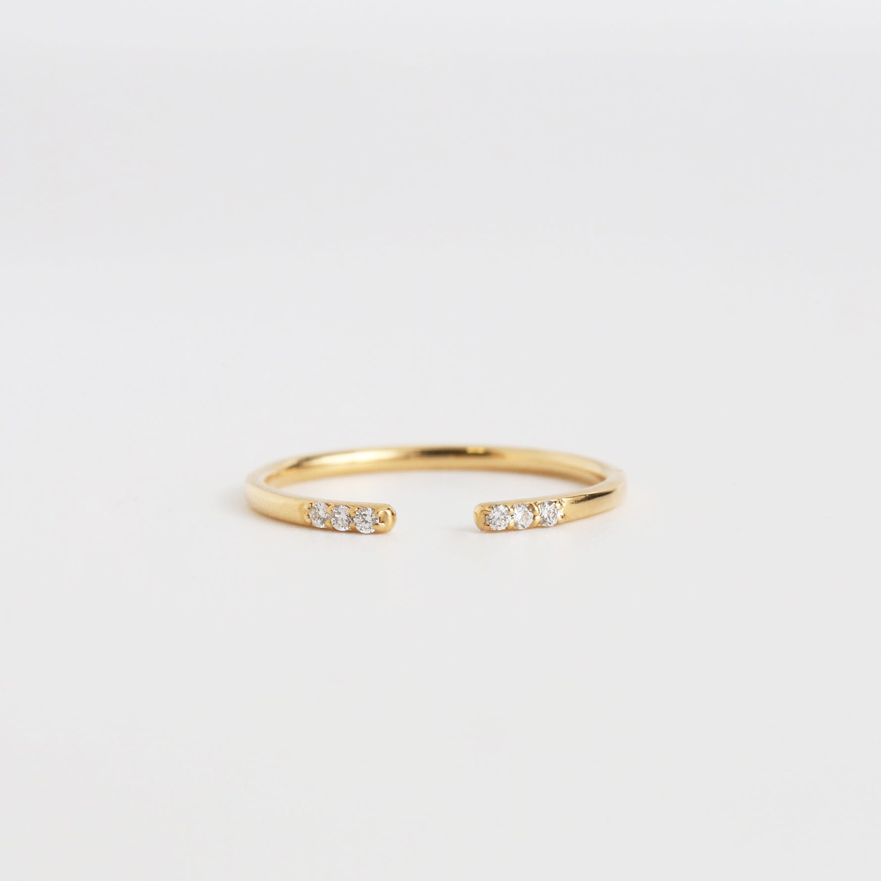 スレンダーで美しい指先を演出してくれるオープンリング。煌びやかな輝きを放つダイヤモンドを飾って洗練された印象にお仕立てしました。1石1石を丁寧に小さな共有爪で留めていますので、ダイヤモンドを遮ることなく小粒ながらも上質なダイヤモンドの輝きを堪能することができます。