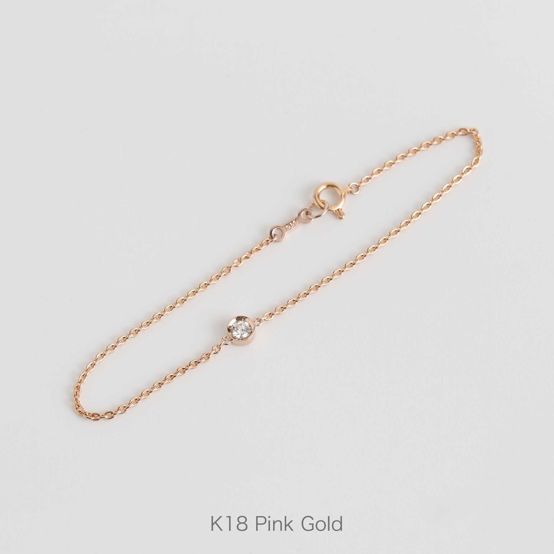 一粒の上質ダイヤモンドだけをセッティングした洗練ブレスレット。材質はゴールドを使用して上質感があるジュエリーのイメージに。ダイヤモンドは爪留めでもない、彫り留めでもない"ちょこ留め"を採用。小さい爪で枠より一段低く留めることでダイヤモンドをハッキリクッキリ見せます。
