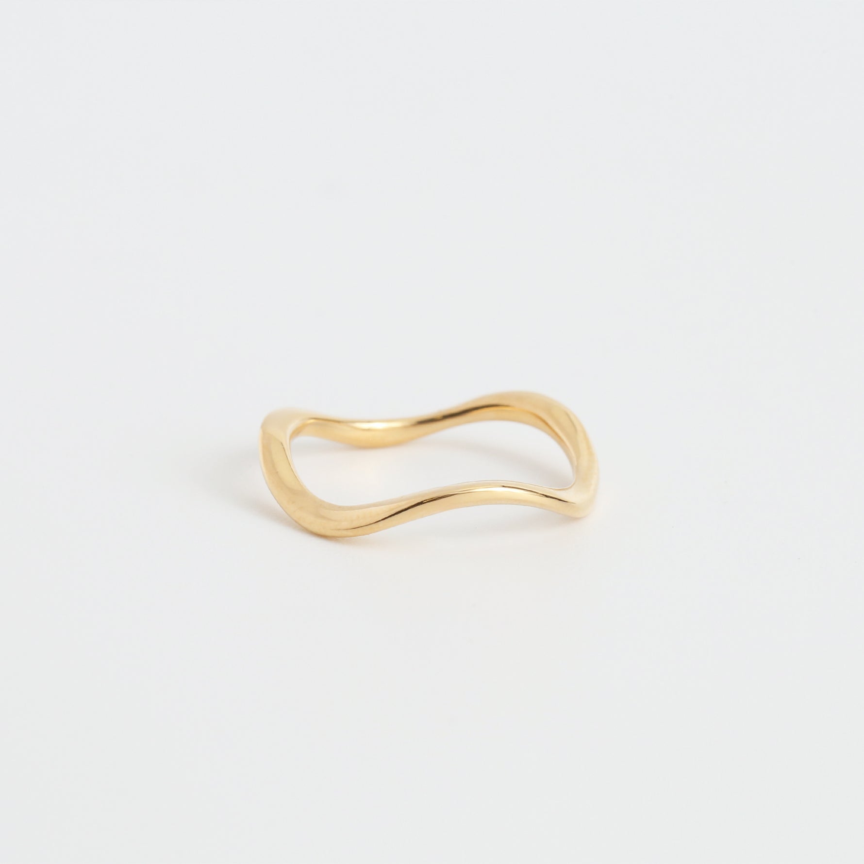 穏やかで緩やかな波の動きをゴールドの曲線で描いたリング。丁寧に磨き上げられたゴールドの艶が光を反射して流動的な波の動きを表現。さらに、幅や厚みに緩急をつけることで波打つように、どこか奥行きのある表情で手元に深みをプラスしてくれます。