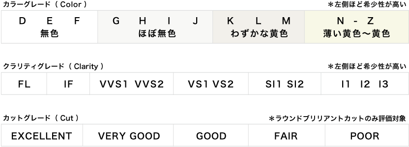 AVARONでは商品にもよりますがHカラー/SIクラスを基準にしております。各グレード前後の差は肉眼ではほとんど判別できない程度です。AVARON基準のダイヤよりも上位グレードをご希望の場合も追加料金にて、ご対応可能ですので先ずはお気軽にお問い合わせください。