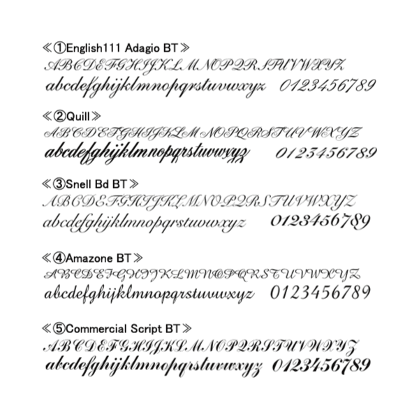 ・下部リストより、ご希望のフォントお選びいただくことも可能です。特にご指定のない場合にはシンプルなブロック体での刻印となります。
