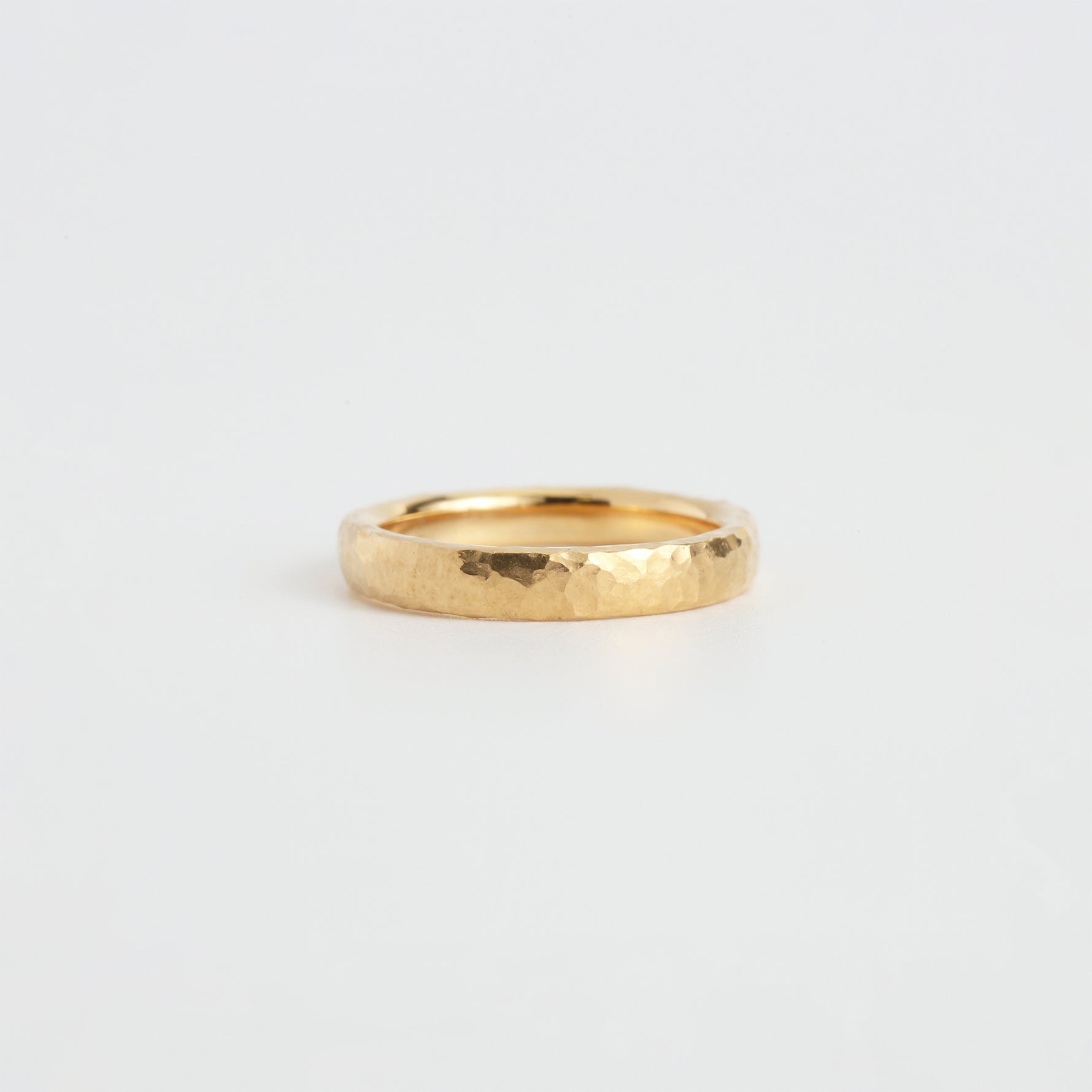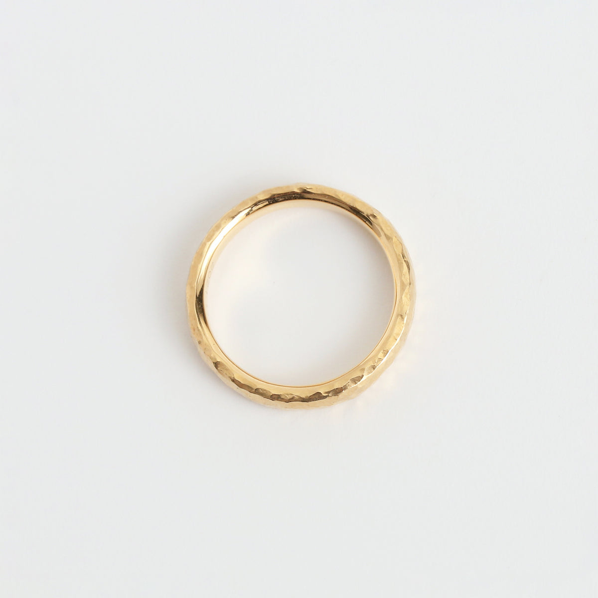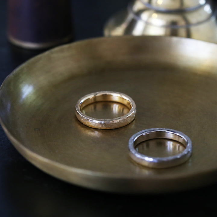 こちらはクラフト感のあるハンマータイプ。金槌で一打一打丁寧に叩き出された不規則なテクスチャーは、光を受けるたびに多彩な表情を生み出します。外側に印象的な輝きを宿しつつ、内側は指にすっと馴染む快適な着け心地に。