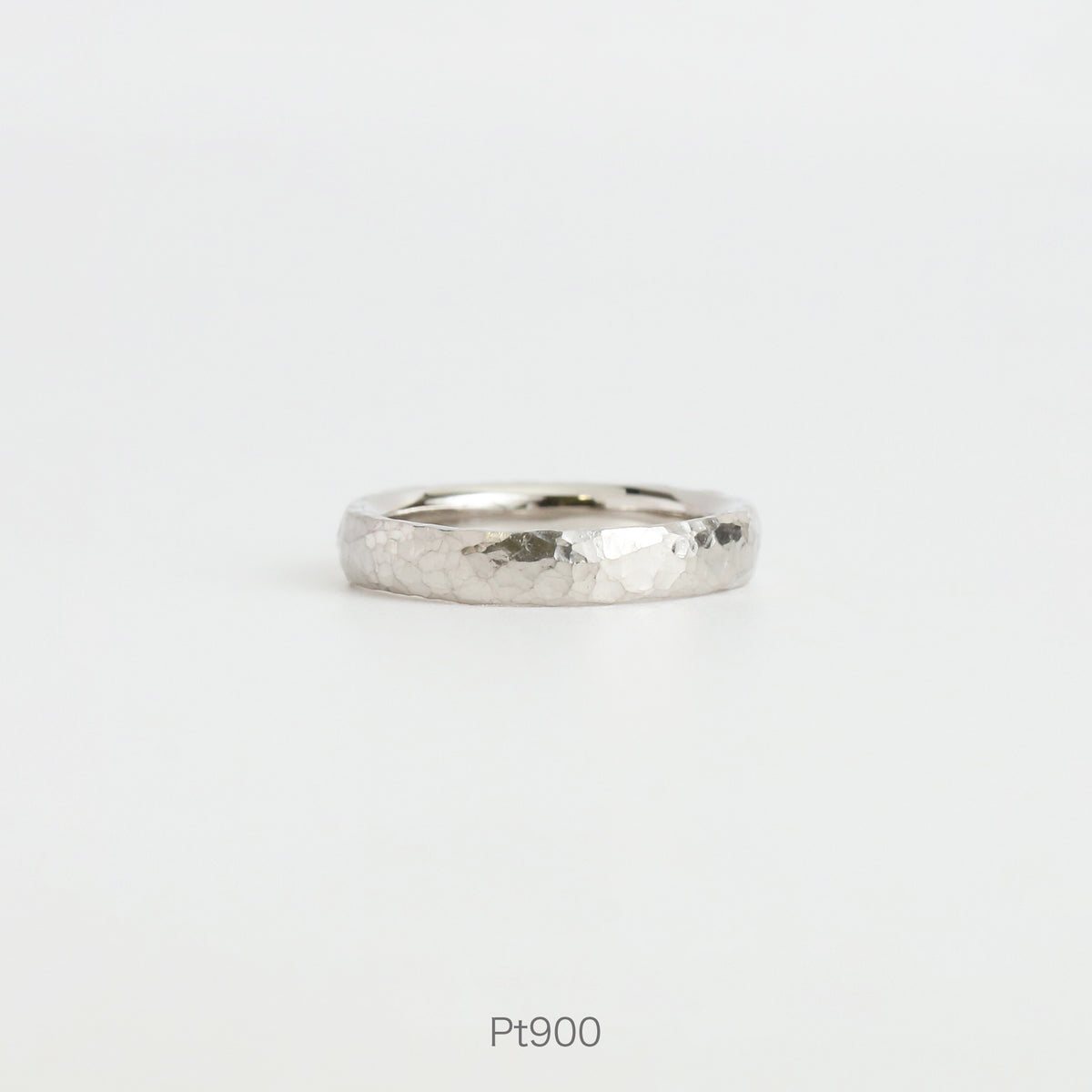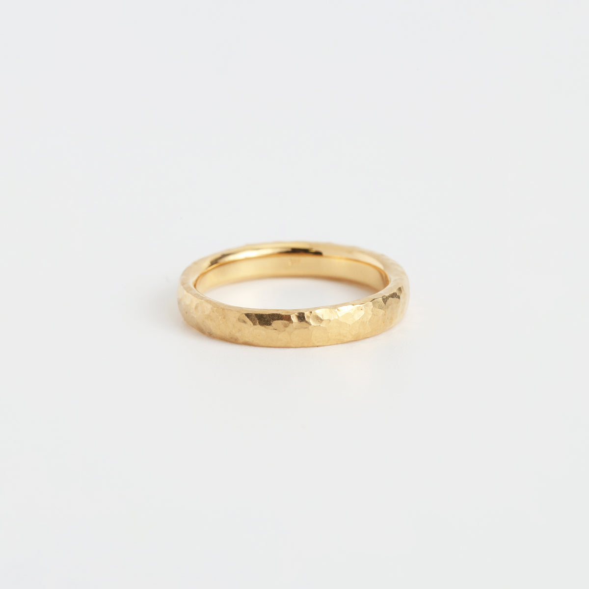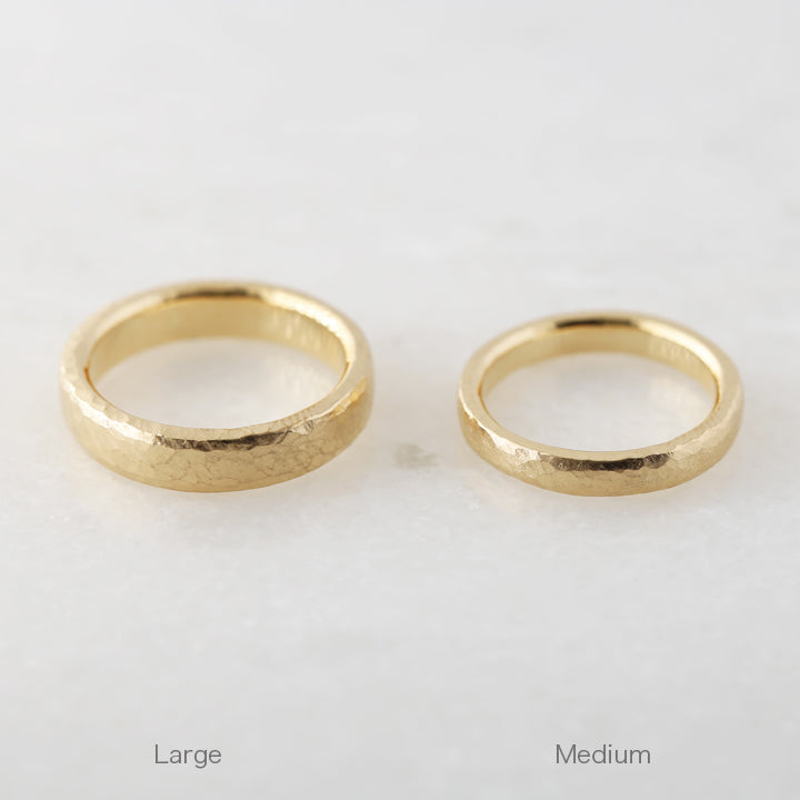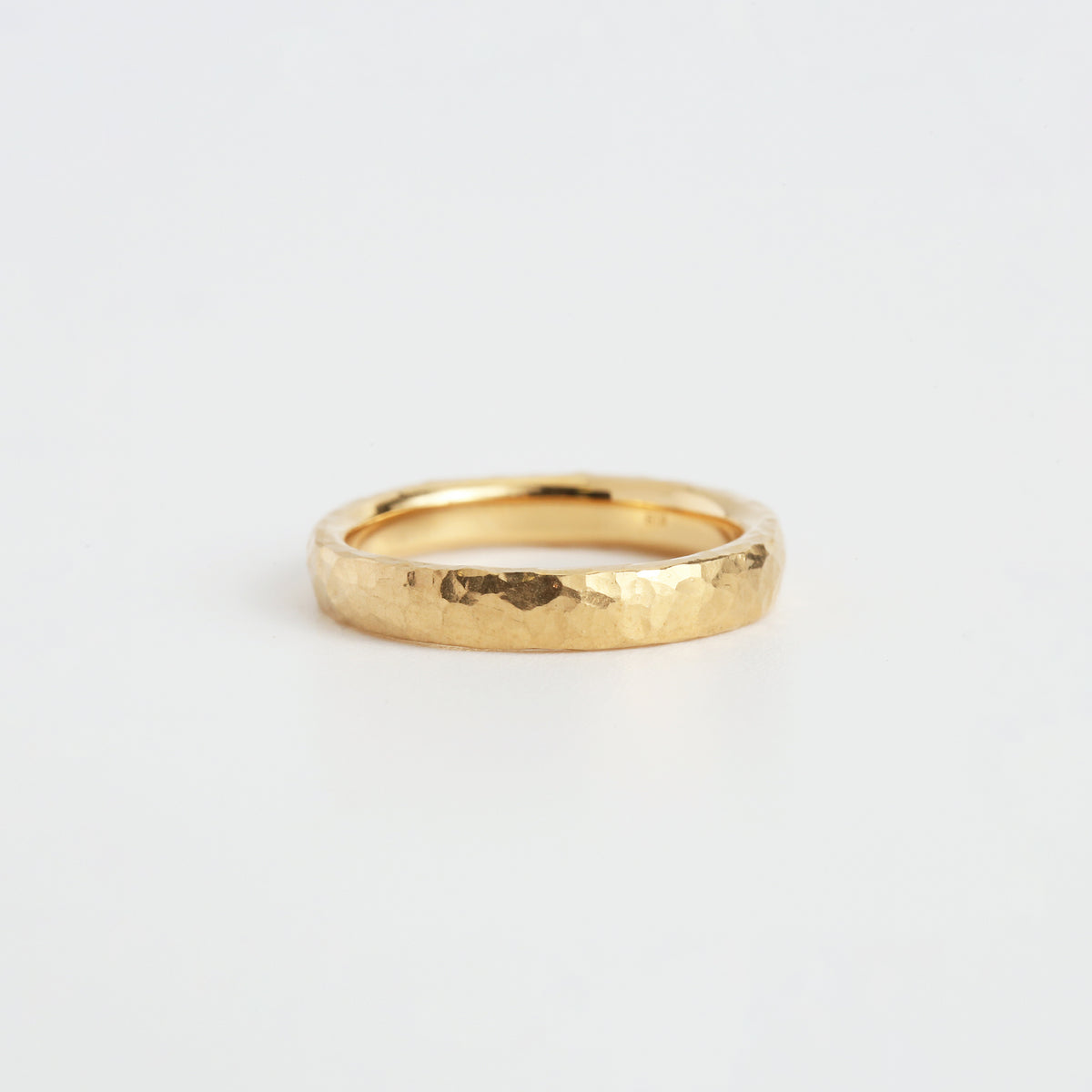 こちらはクラフト感のあるハンマータイプ。金槌で一打一打丁寧に叩き出された不規則なテクスチャーは、光を受けるたびに多彩な表情を生み出します。外側に印象的な輝きを宿しつつ、内側は指にすっと馴染む快適な着け心地に。