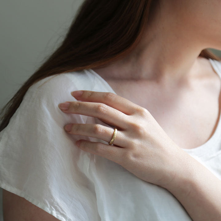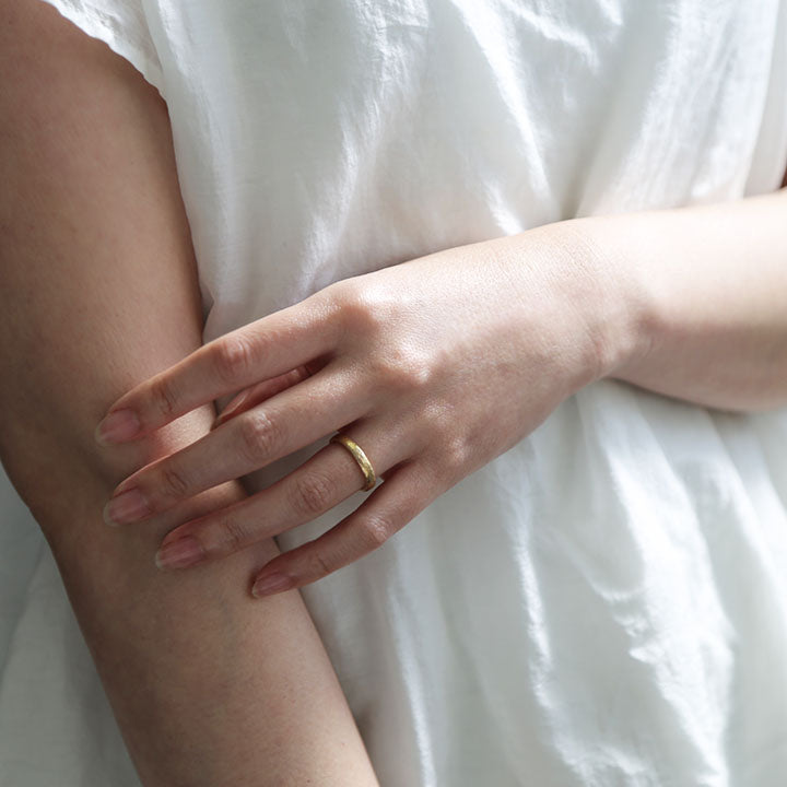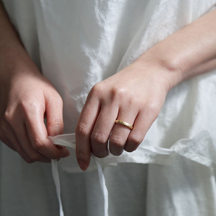 凹凸が織りなすナチュラルなゴールドのきらめきは使い込むほどに味わいを増し、持ち主だけの表情へと育っていきます。自分らしさを大切にする日常のジュエリーとしてはもちろん、結婚指輪やペアリングとしてもおすすめです。