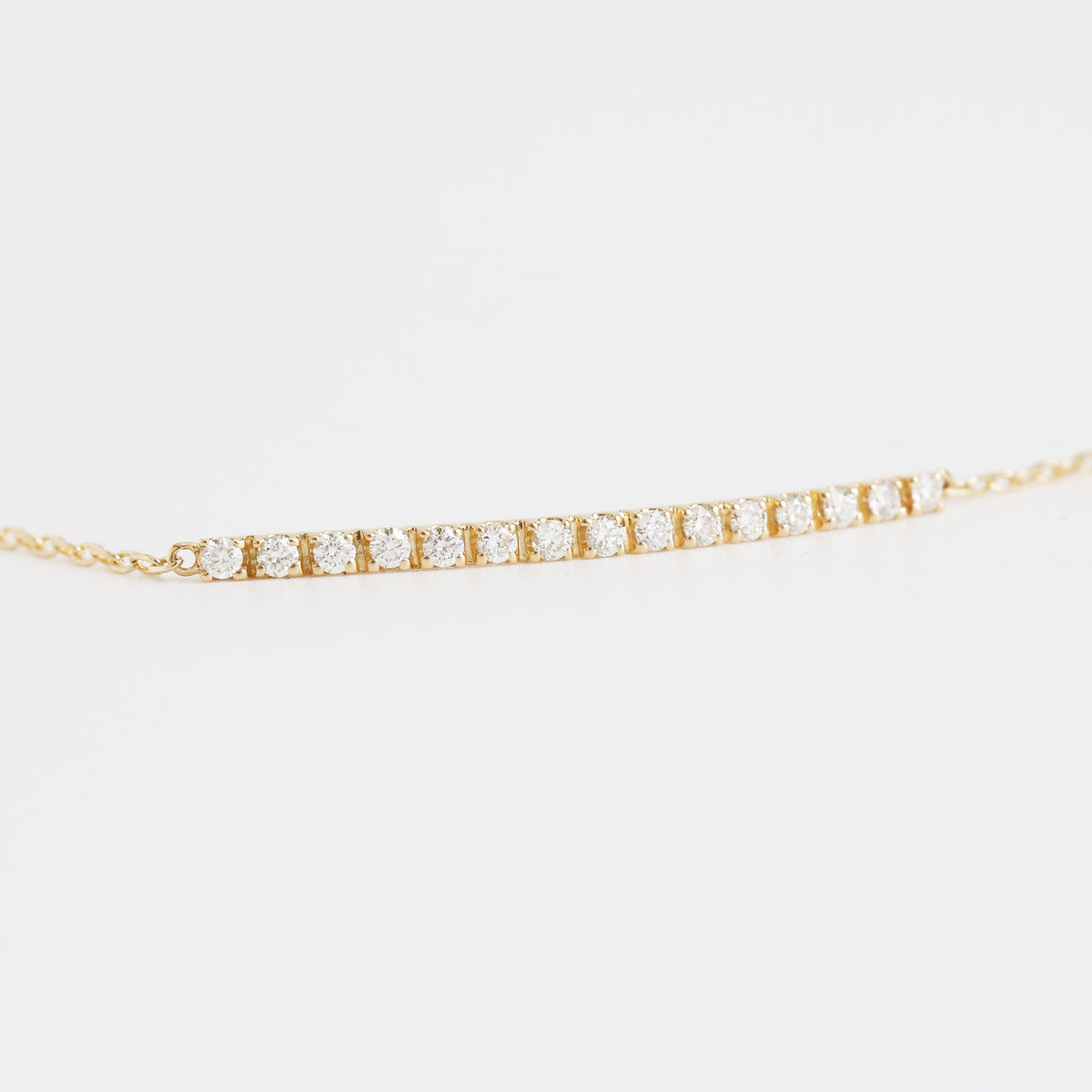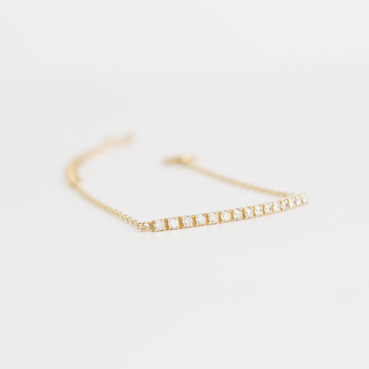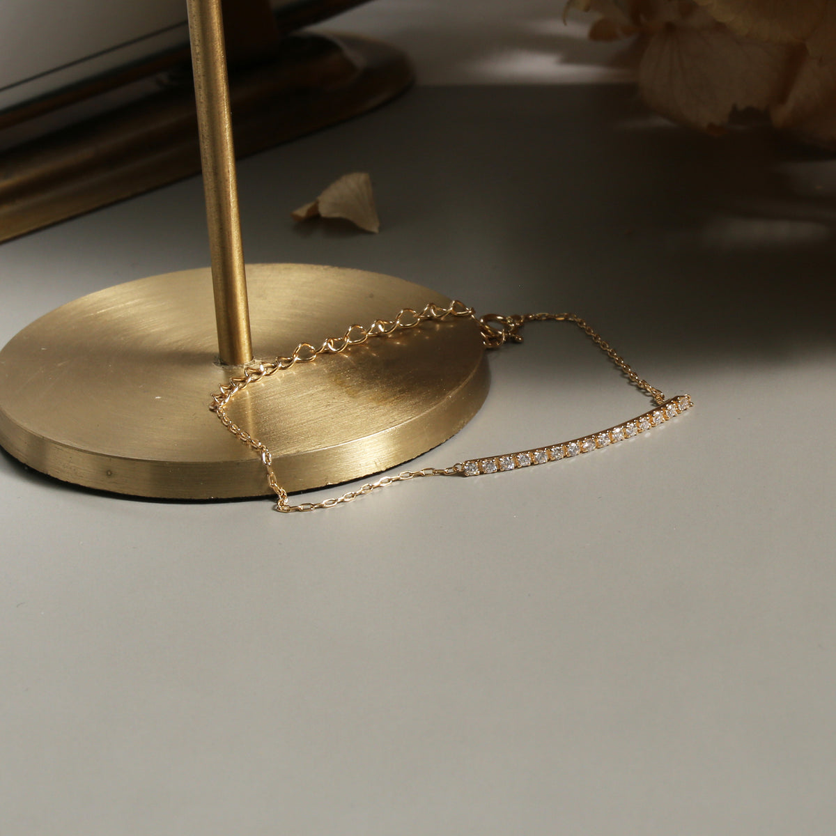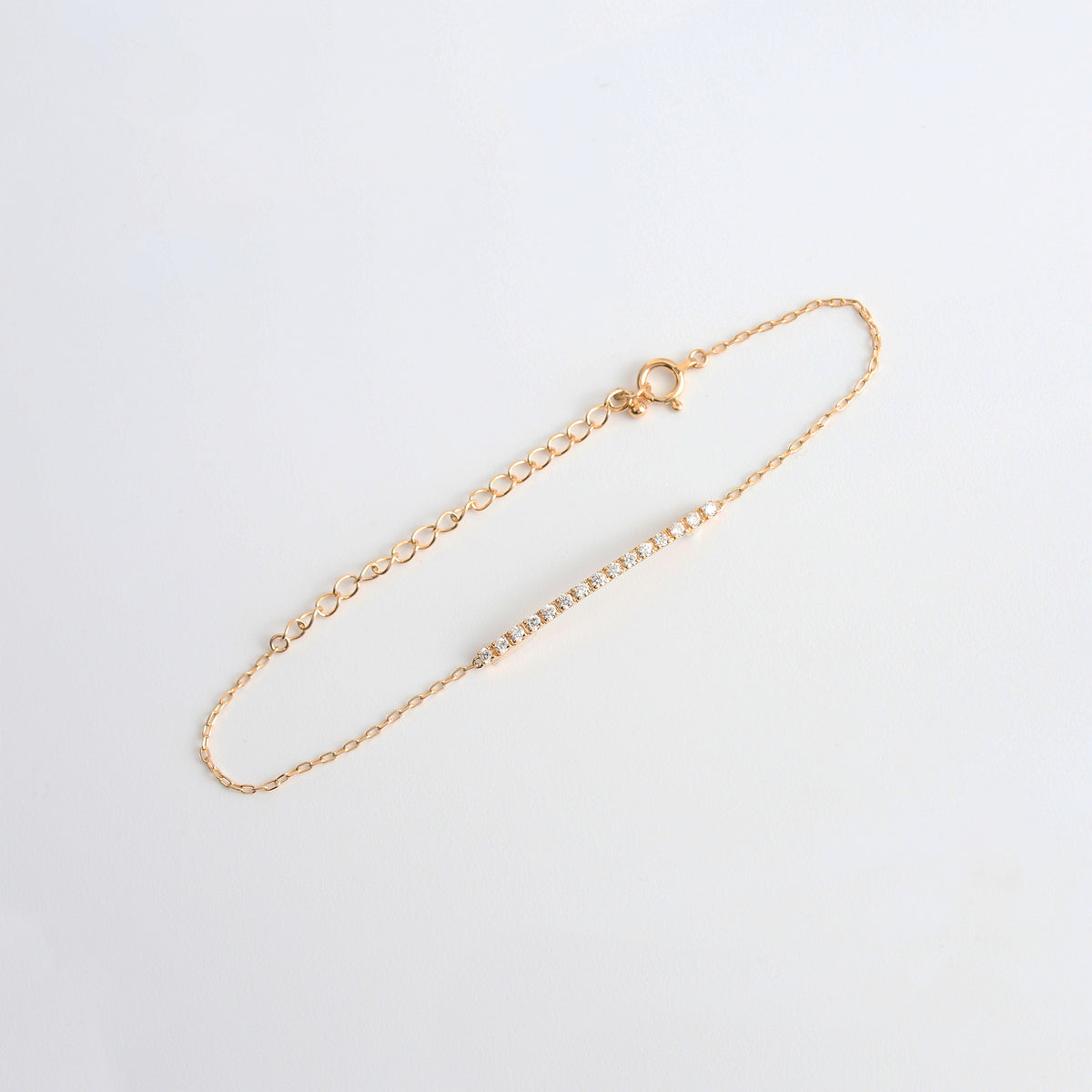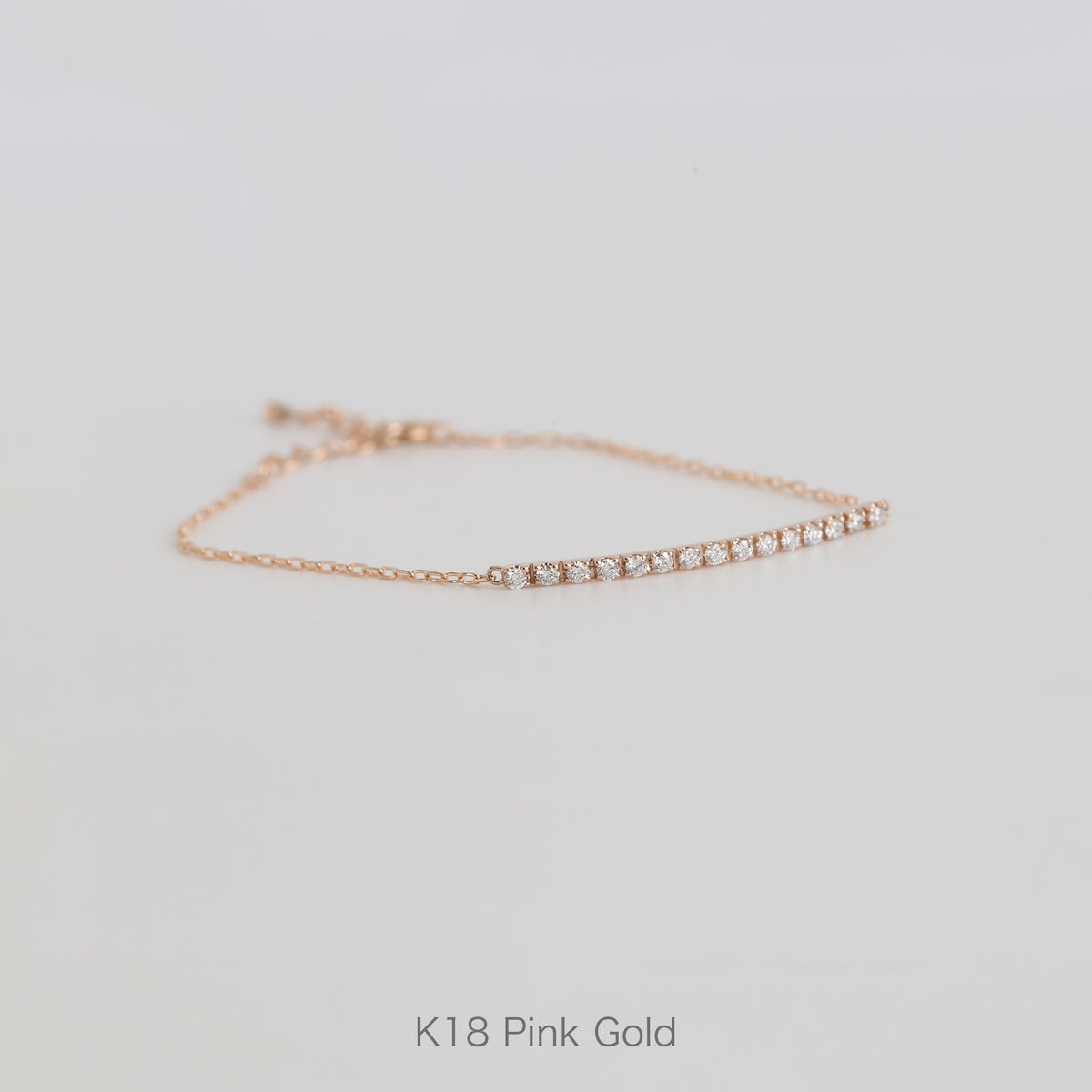 15石の上質なダイヤモンドを直線状にあしらったデザインブレスレット。ダイヤは1つ1つ丁寧に4本の爪で留められていて端正な印象を与えますのでカジュアルな装いはもちろん、キチンと感のあるキレイ目スタイルにも相性が良いです。