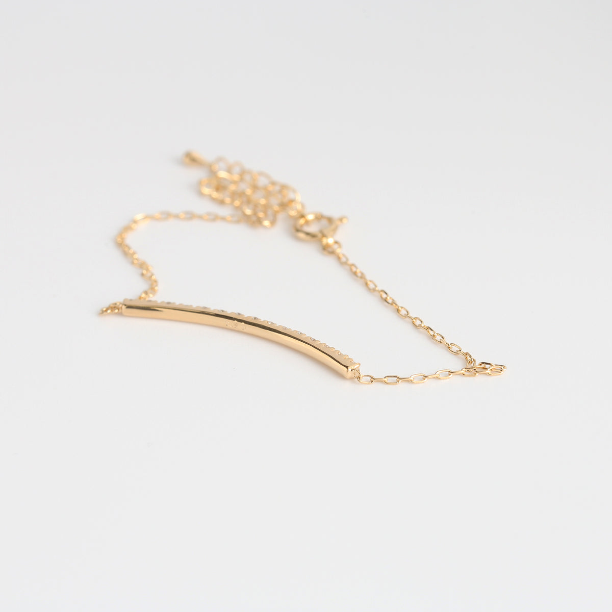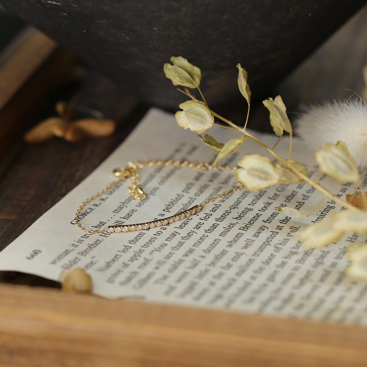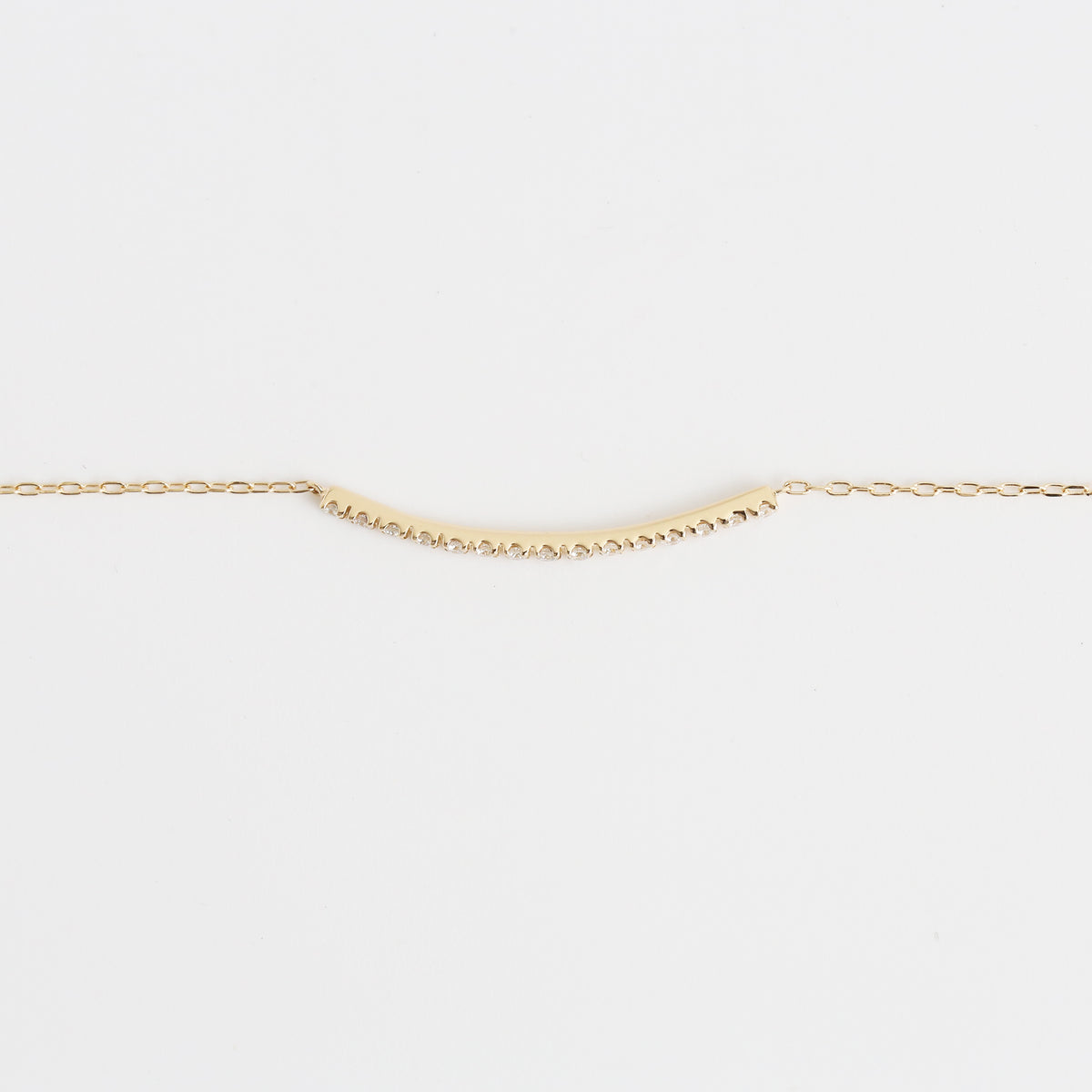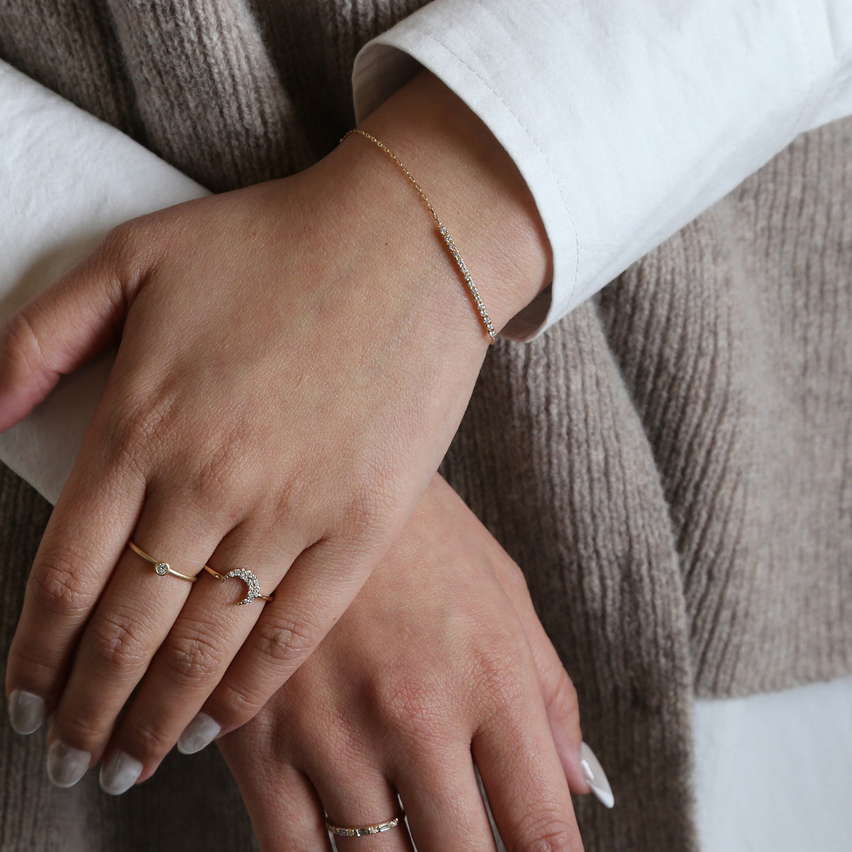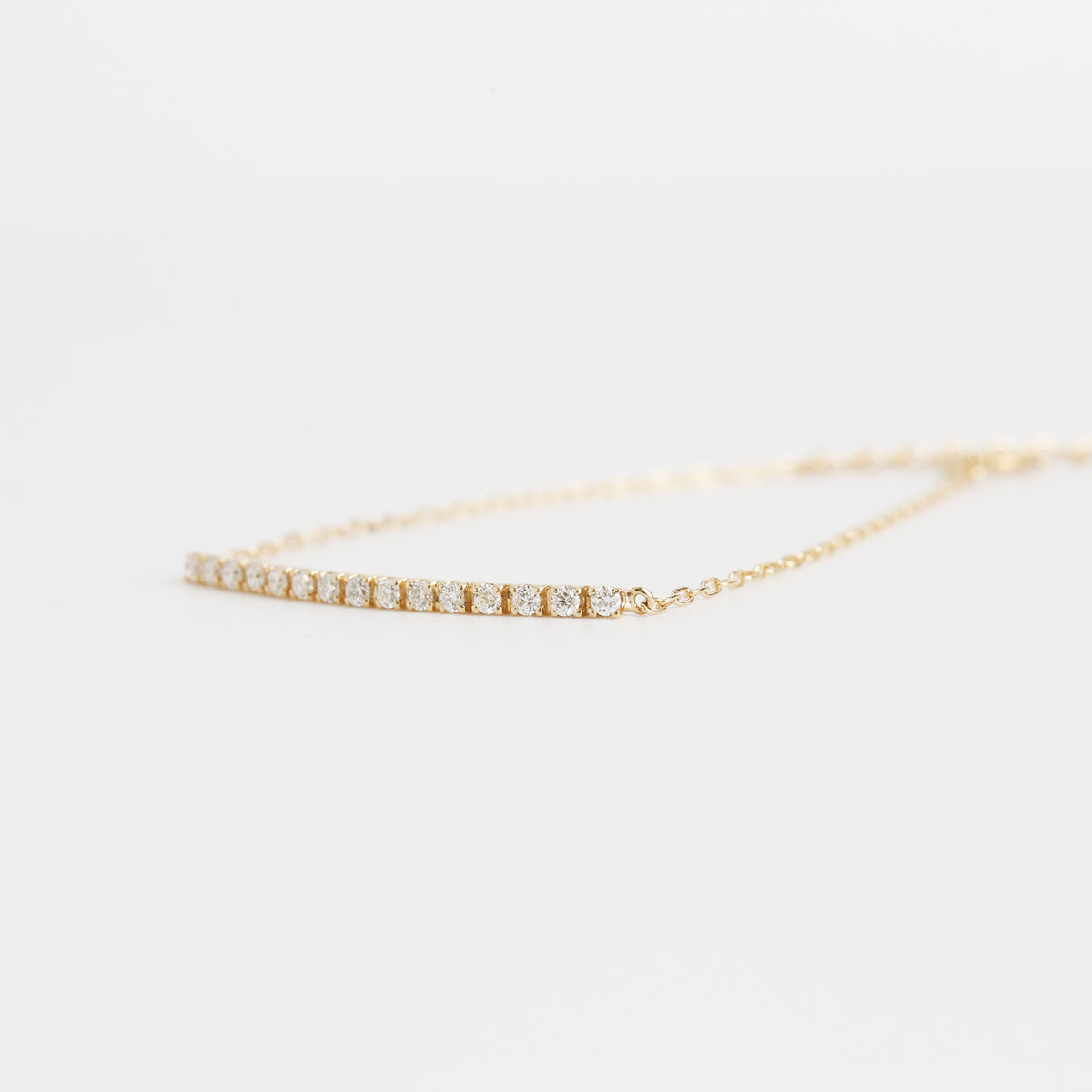 15石の上質なダイヤモンドを直線状にあしらったデザインブレスレット。ダイヤは1つ1つ丁寧に4本の爪で留められていて端正な印象を与えますのでカジュアルな装いはもちろん、キチンと感のあるキレイ目スタイルにも相性が良いです。
