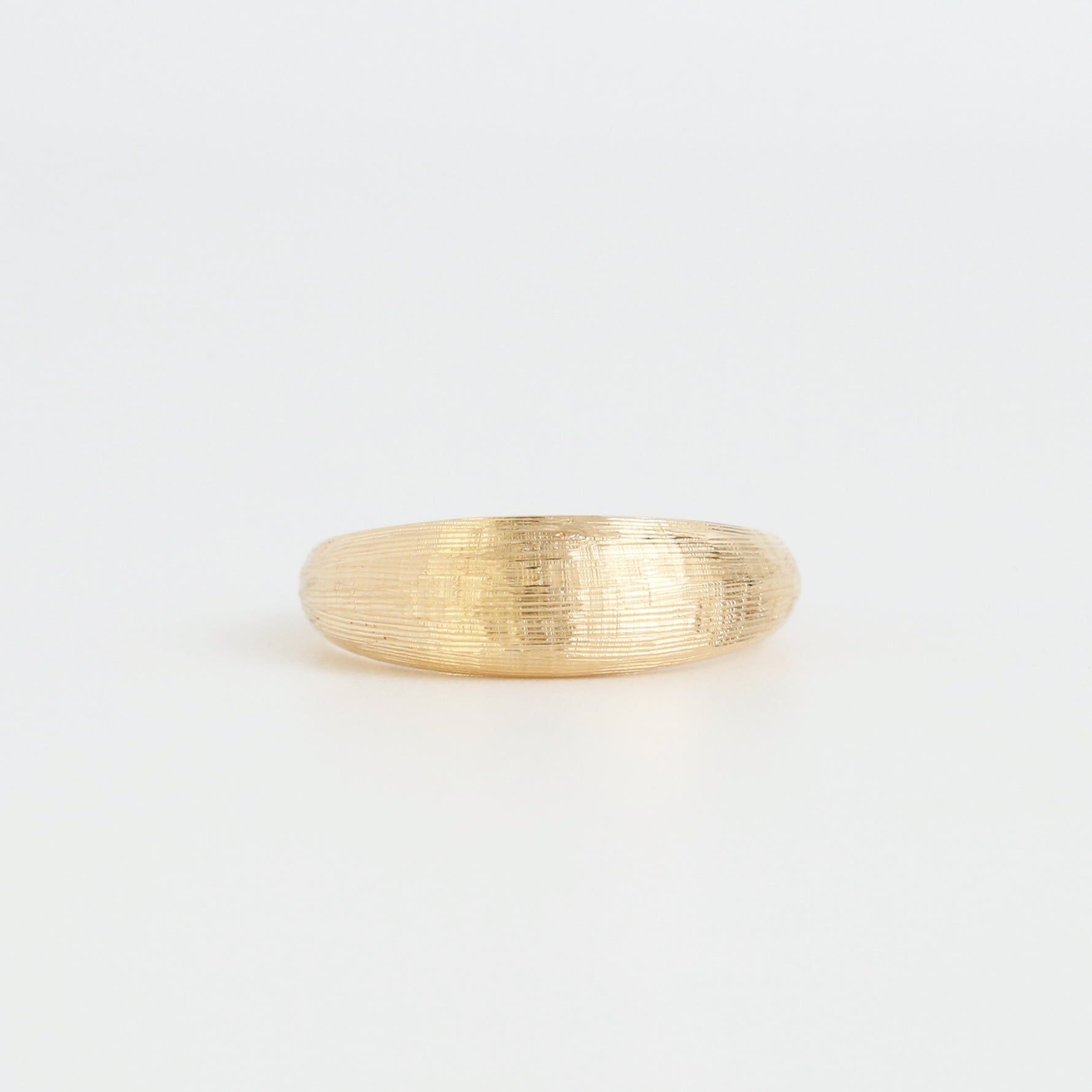 ゴールドの表面にヘアラインでモードテイストを加味させた地金リング。表面全体にヘアライン加工で細やかな線を施し、独特な雰囲気に仕上げました。職人の手作業によって施された、1本1本の線の凹凸が生み出す陰影が表情豊かに指先を演出します。