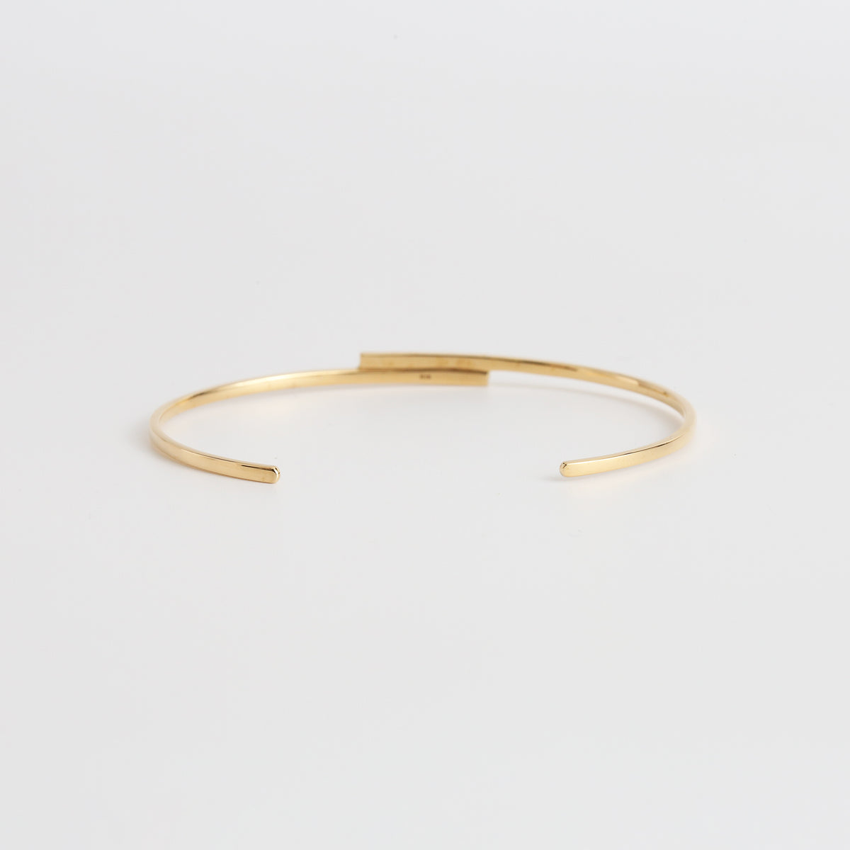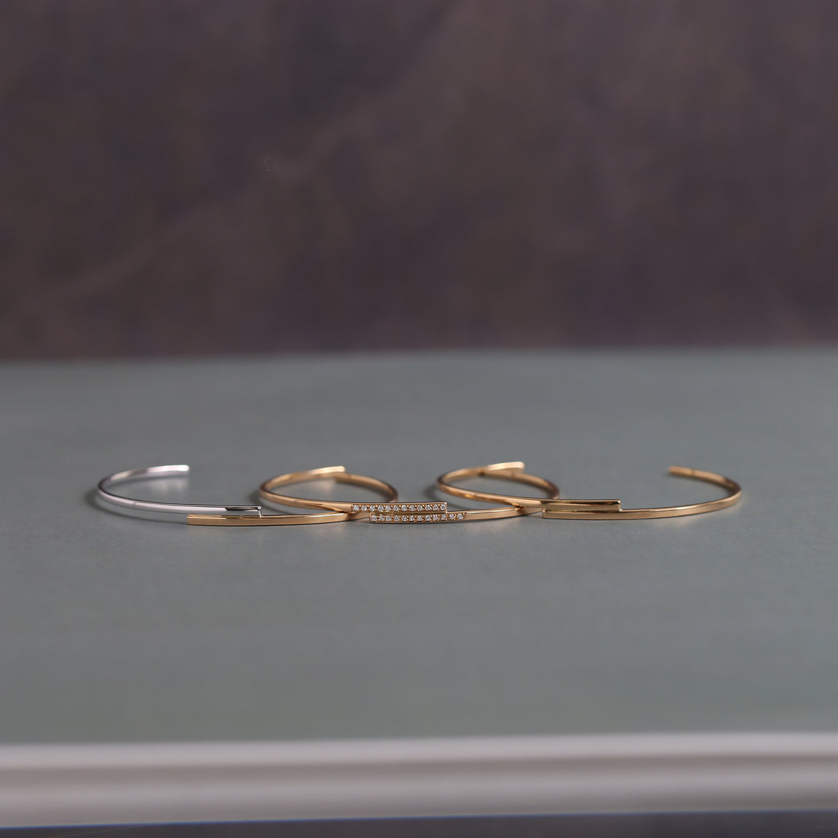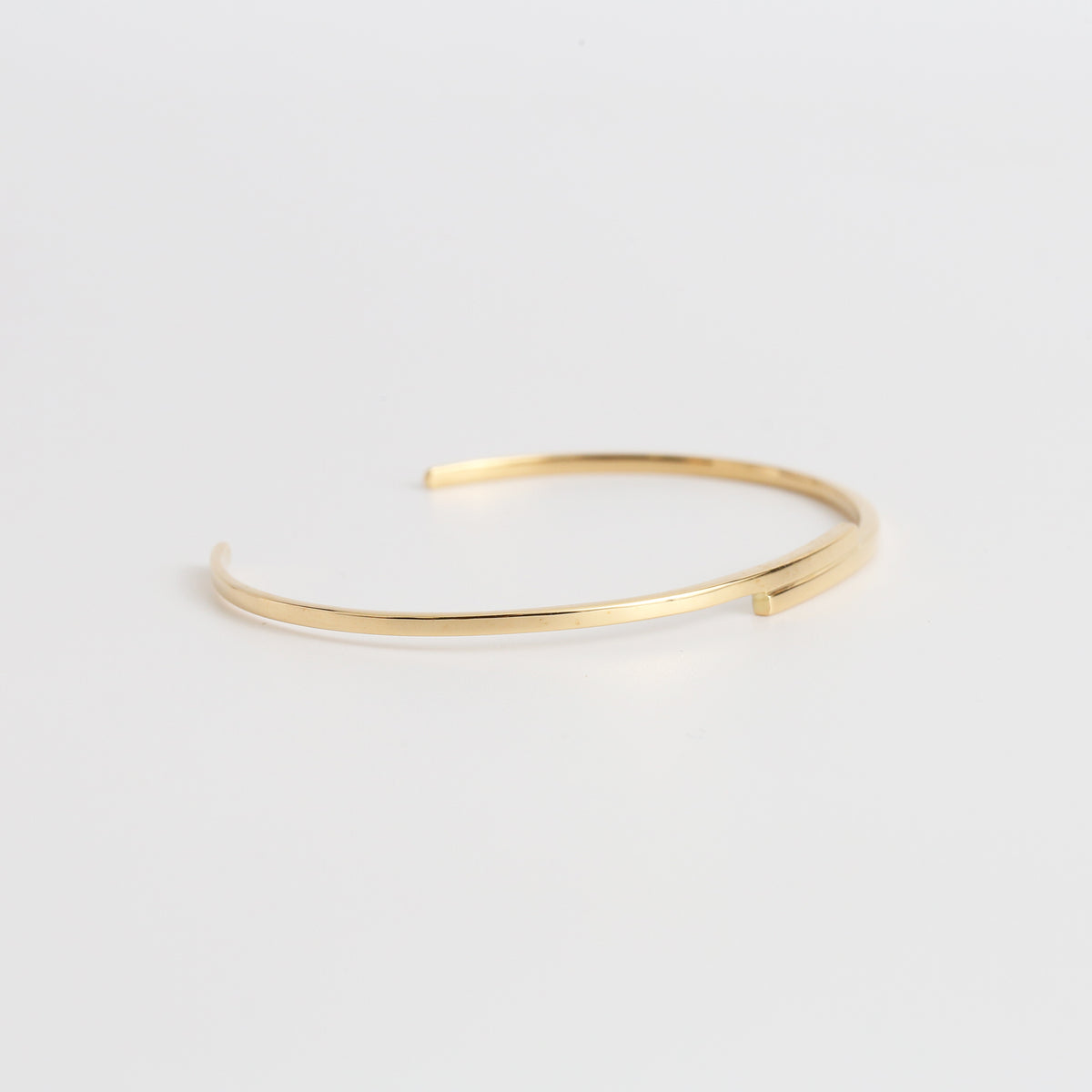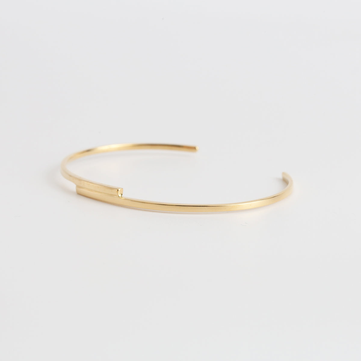 表面はエッジを効かせた角線のデザインで、内側に向かって柔らかく角を落とすことで、"美しいシルエット"と"着け心地の良さ"を併せ持ちます。艶やかなゴールドの輝きが肌に馴染み、身に着けるだけで、モード感をプラスしてオールシーズンの装いを華やかに昇華させます。お手持ちのブレスレットなどと一緒にレイヤードスタイルもお愉しみください。