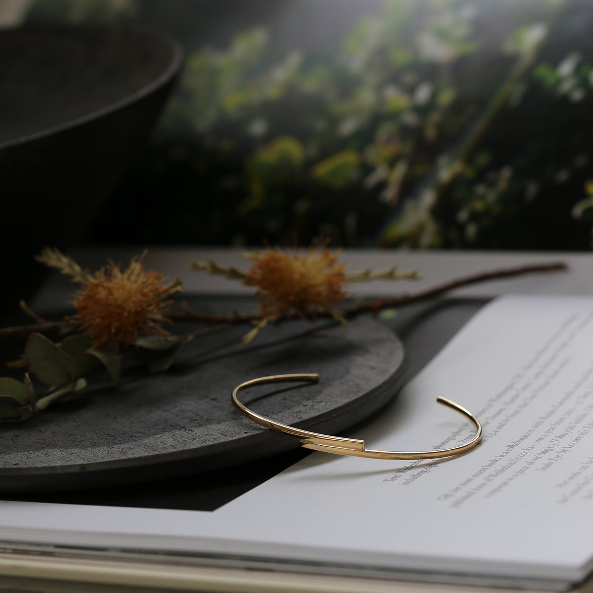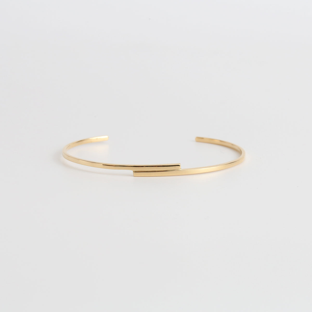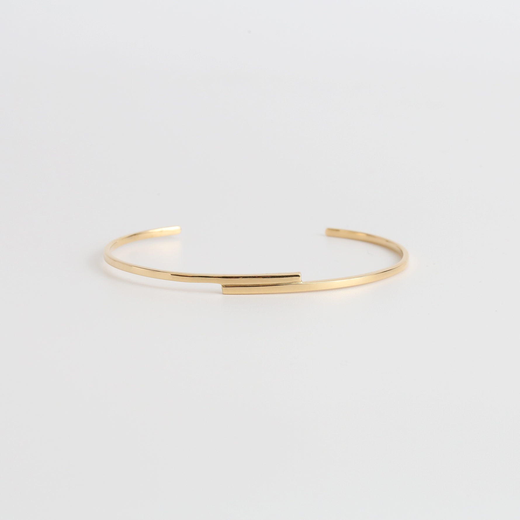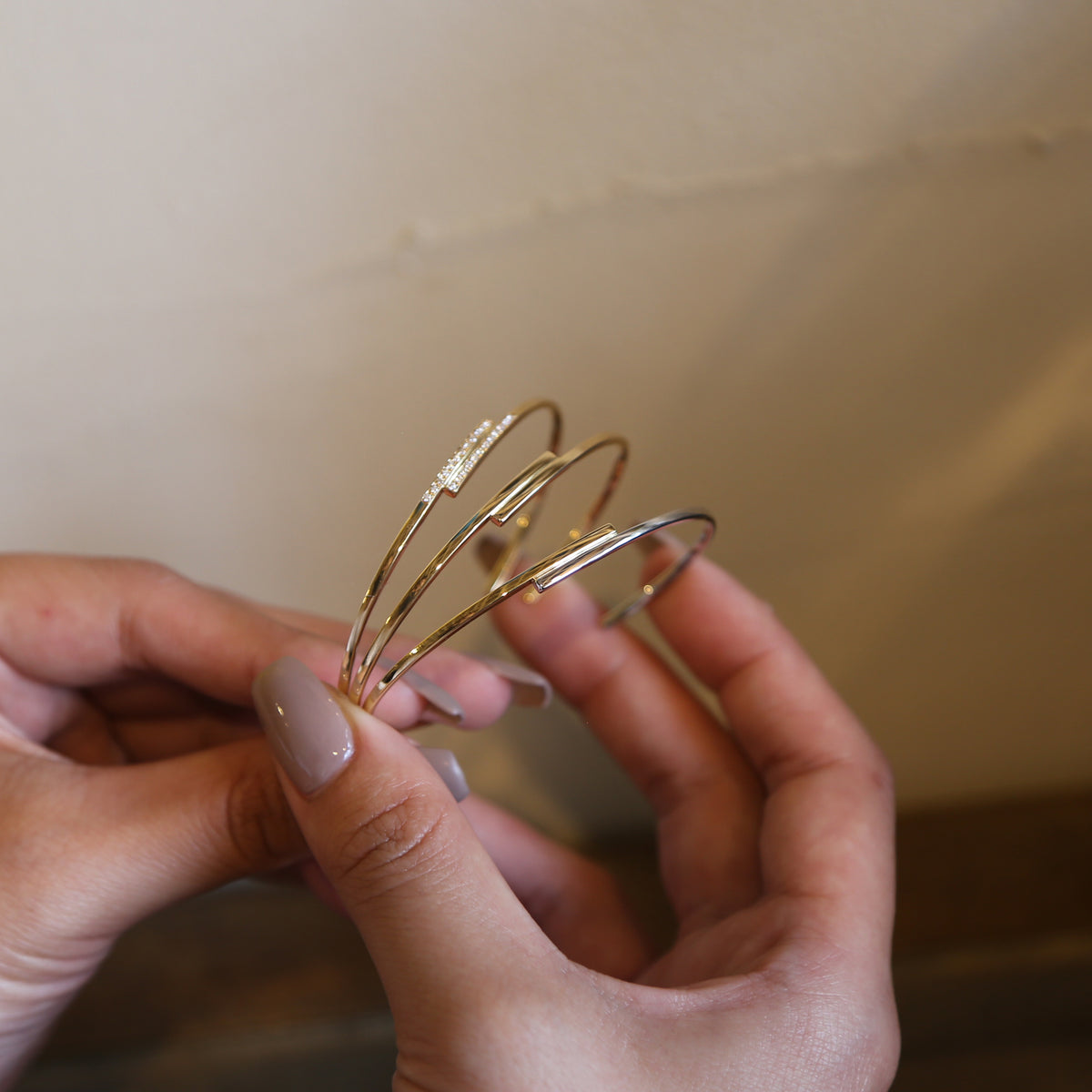 表面はエッジを効かせた角線のデザインで、内側に向かって柔らかく角を落とすことで、"美しいシルエット"と"着け心地の良さ"を併せ持ちます。艶やかなゴールドの輝きが肌に馴染み、身に着けるだけで、モード感をプラスしてオールシーズンの装いを華やかに昇華させます。お手持ちのブレスレットなどと一緒にレイヤードスタイルもお愉しみください。