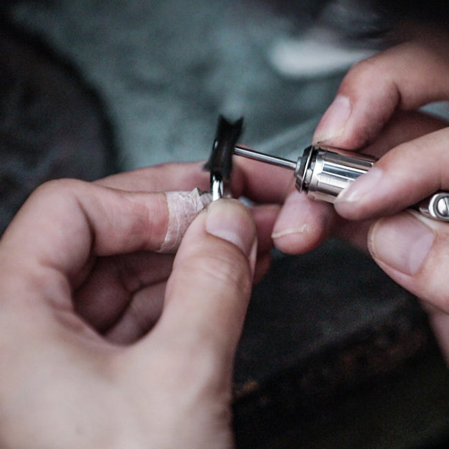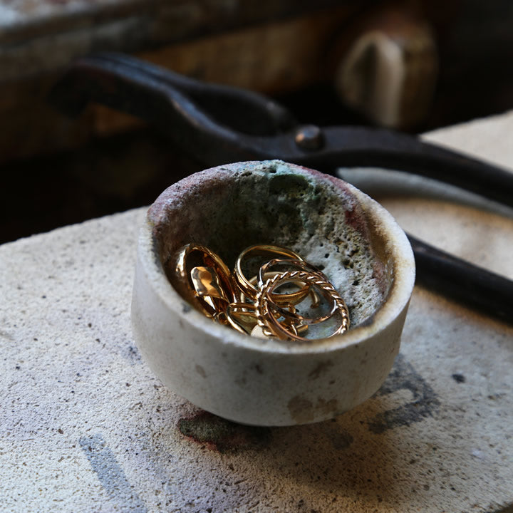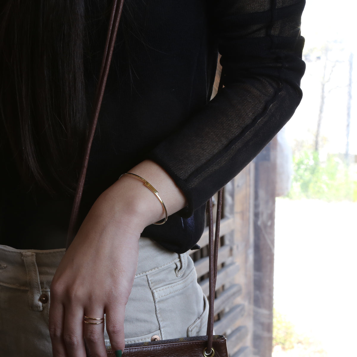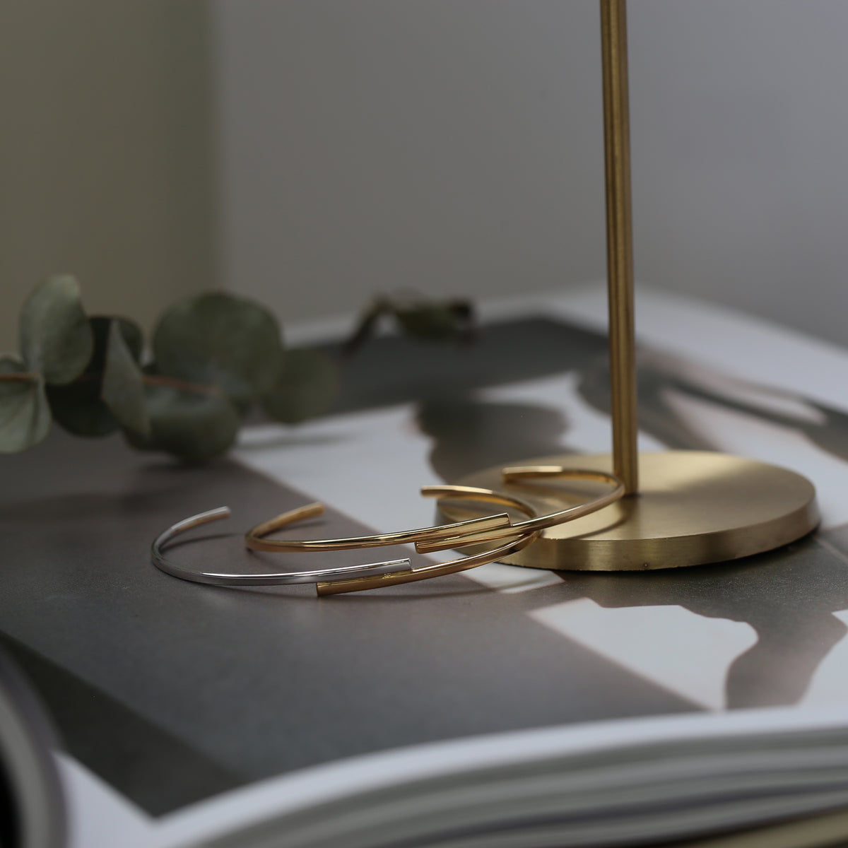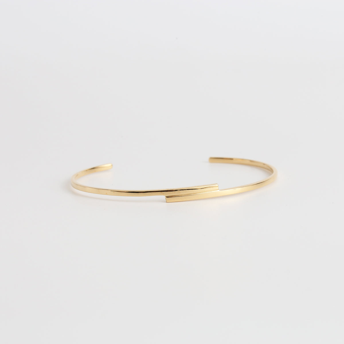 表面はエッジを効かせた角線のデザインで、内側に向かって柔らかく角を落とすことで、"美しいシルエット"と"着け心地の良さ"を併せ持ちます。艶やかなゴールドの輝きが肌に馴染み、身に着けるだけで、モード感をプラスしてオールシーズンの装いを華やかに昇華させます。お手持ちのブレスレットなどと一緒にレイヤードスタイルもお愉しみください。